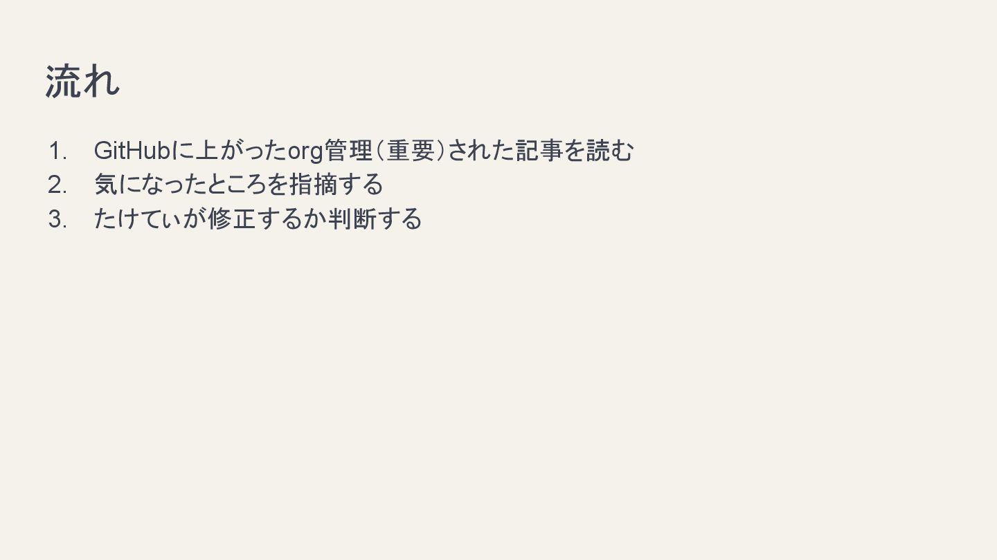 流れ 1. GitHubに上がったorg管理(重要)された記事を読む 2. 気になったところを指摘する 3. たけてぃが修正するか判断する
