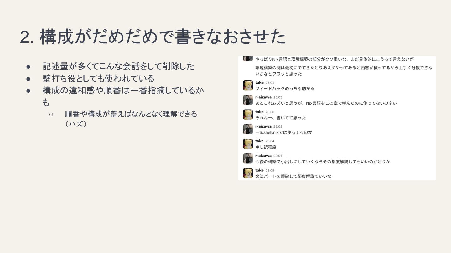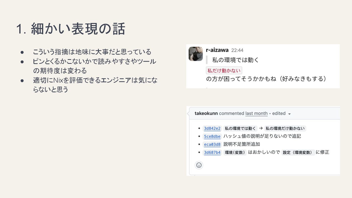 1. 細かい表現の話 • こういう指摘は地味に大事だと思っている • ピンとくるかこないかで読みやすさやツール の期待度は変わる • 適切にNixを評価できるエンジニアは気にな らないと思う