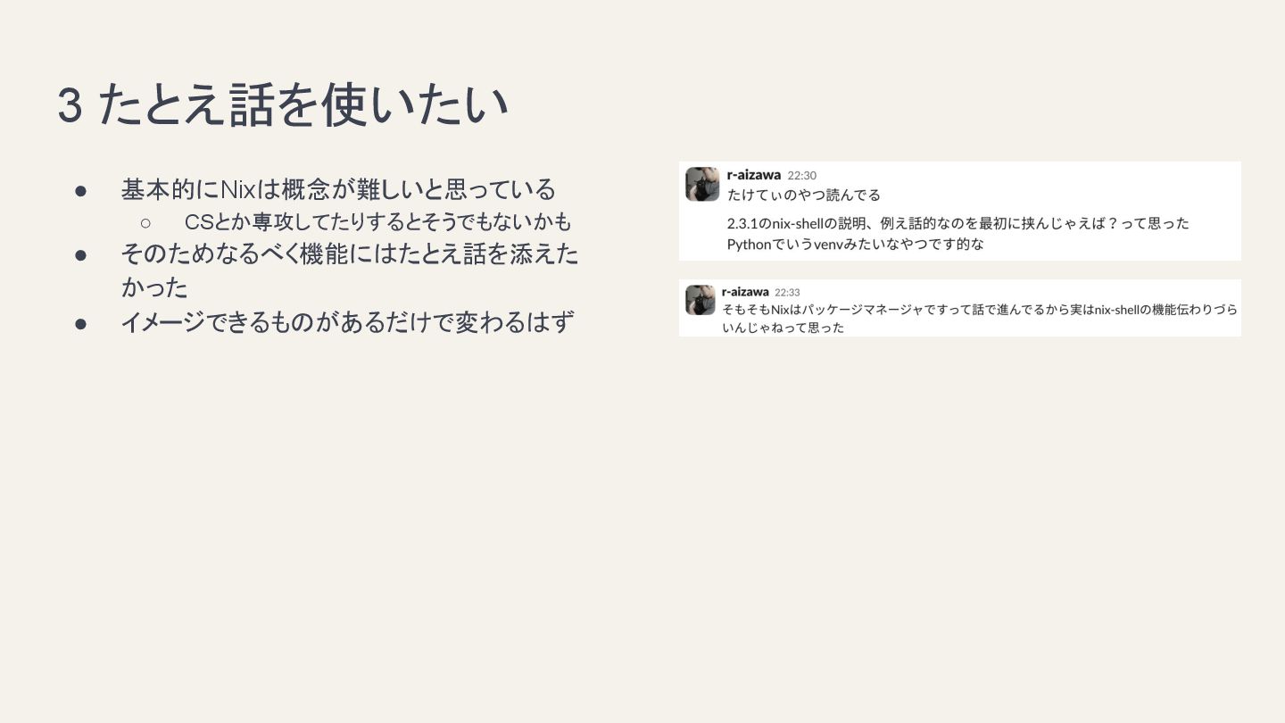 3 たとえ話を使いたい • 基本的にNixは概念が難しいと思っている ◦ CSとか専攻してたりするとそうでもないかも • そのためなるべく機能にはたとえ話を添えた かった •