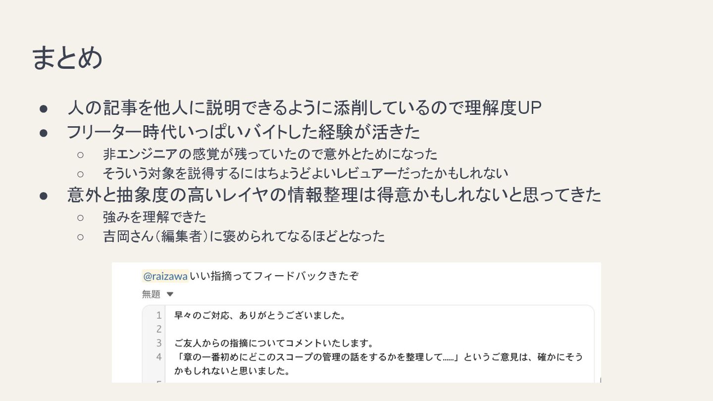 まとめ • 人の記事を他人に説明できるように添削しているので理解度UP • フリーター時代いっぱいバイトした経験が活きた ◦ 非エンジニアの感覚が残っていたので意外とためになった ◦ そういう対象を説得するにはちょうどよいレビュアーだったかもしれない •