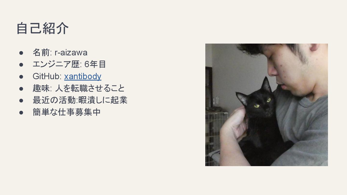 自己紹介 • 名前: r-aizawa • エンジニア歴: 6年目 • GitHub: xantibody