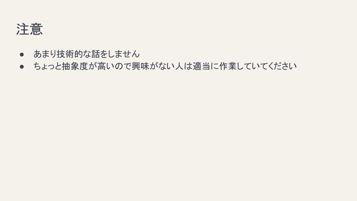 注意 • あまり技術的な話をしません • ちょっと抽象度が高いので興味がない人は適当に作業していてください