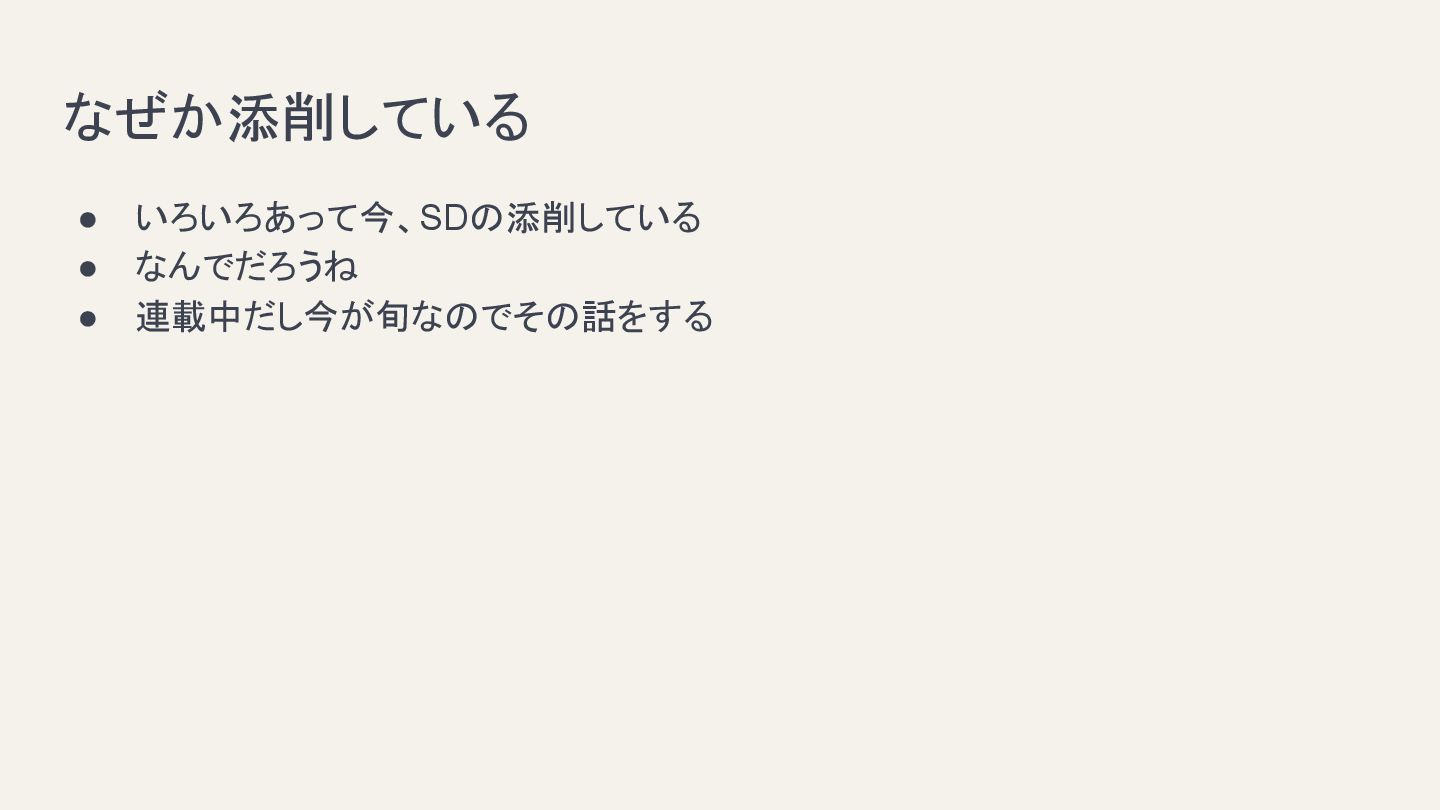 なぜか添削している • いろいろあって今、SDの添削している • なんでだろうね • 連載中だし今が旬なのでその話をする