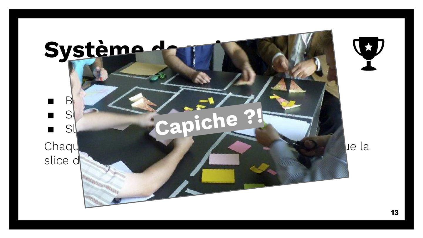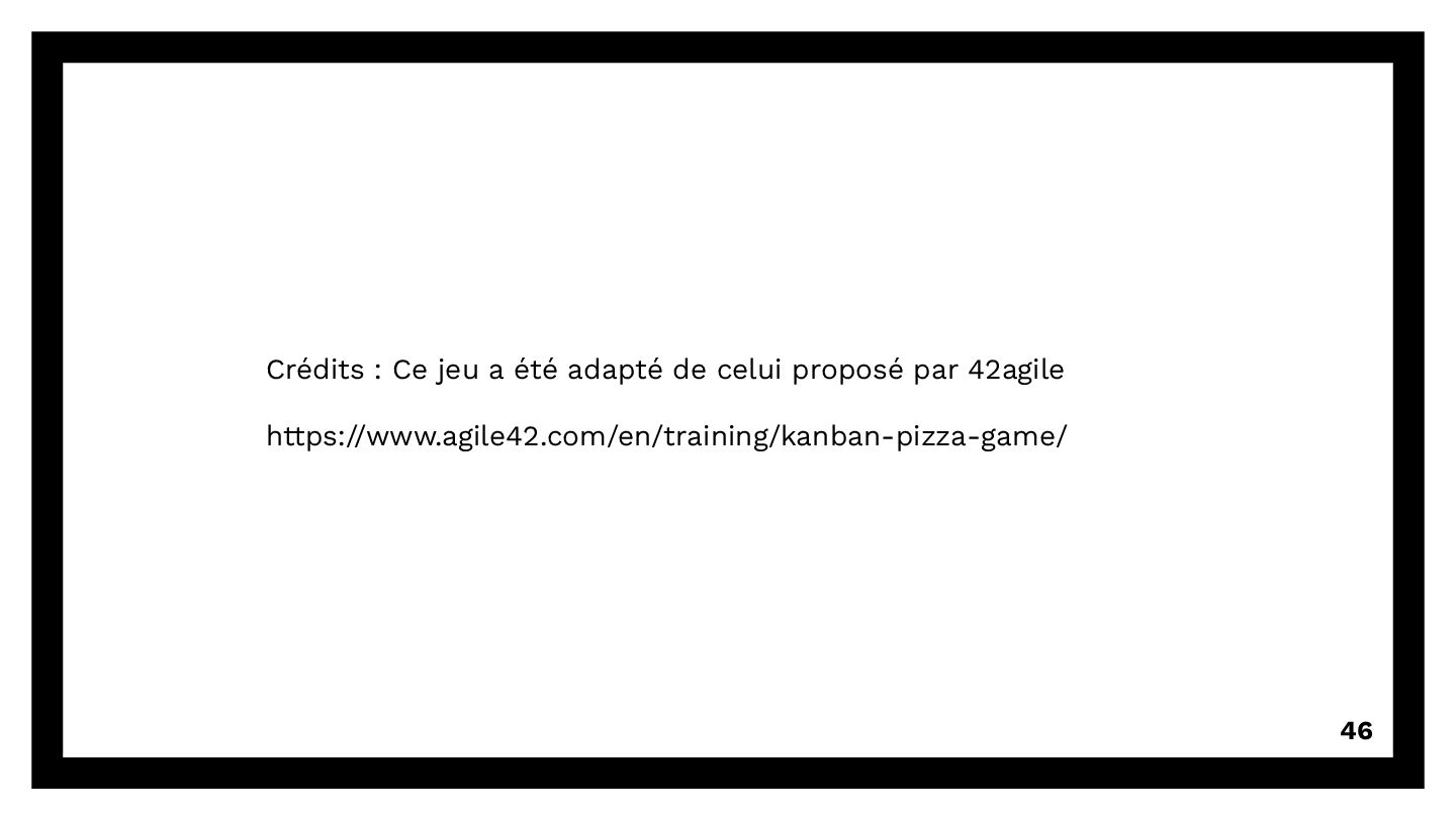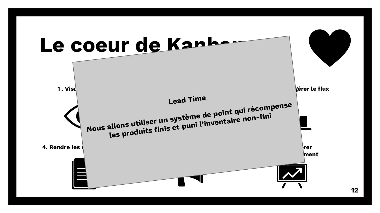 Limiter le travail en cours 3. Mesurer et gérer le flux 4. Rendre les règles explicites 5. Créer des loops de feedback 6. S’améliorer collaborativement 12 Lead Time Nous allons utiliser un système de point qui récompense les produits finis et puni l’inventaire non-fini