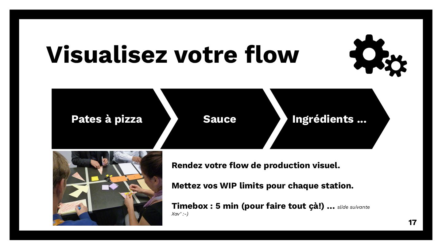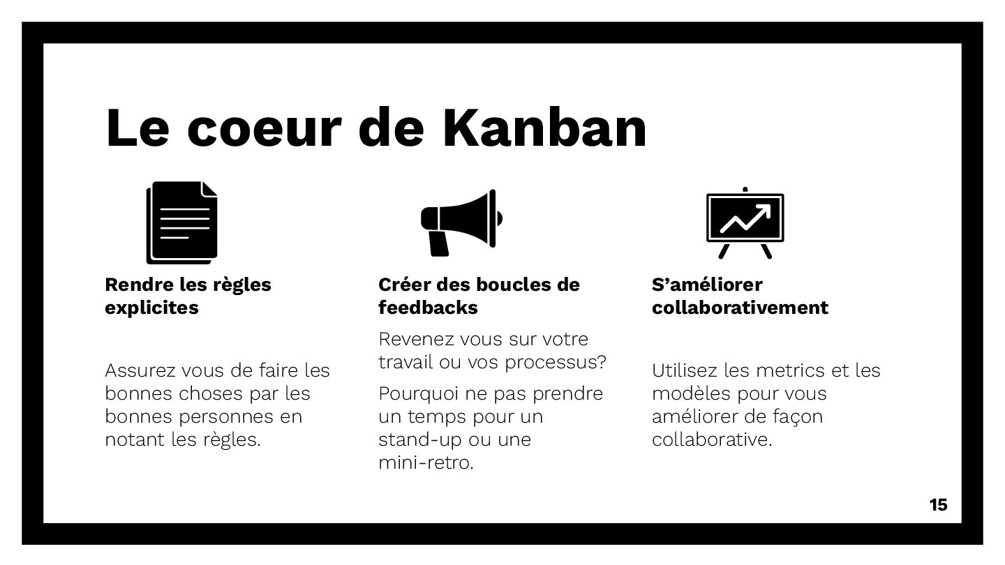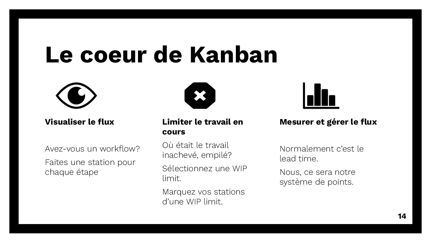Faites une station pour chaque étape Limiter le travail en cours Où était le travail inachevé, empilé? Sélectionnez une WIP limit. Marquez vos stations d’une WIP limit. Mesurer et gérer le flux Normalement c’est le lead time. Nous, ce sera notre système de points. 14