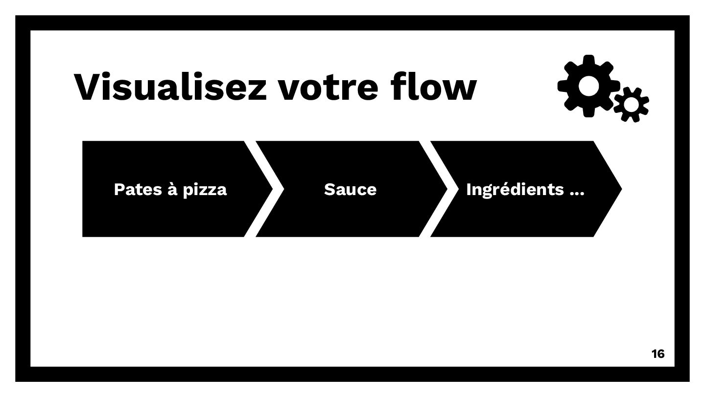 de faire les bonnes choses par les bonnes personnes en notant les règles. Créer des boucles de feedbacks Revenez vous sur votre travail ou vos processus? Pourquoi ne pas prendre un temps pour un stand-up ou une mini-retro. S’améliorer collaborativement Utilisez les metrics et les modèles pour vous améliorer de façon collaborative. 15