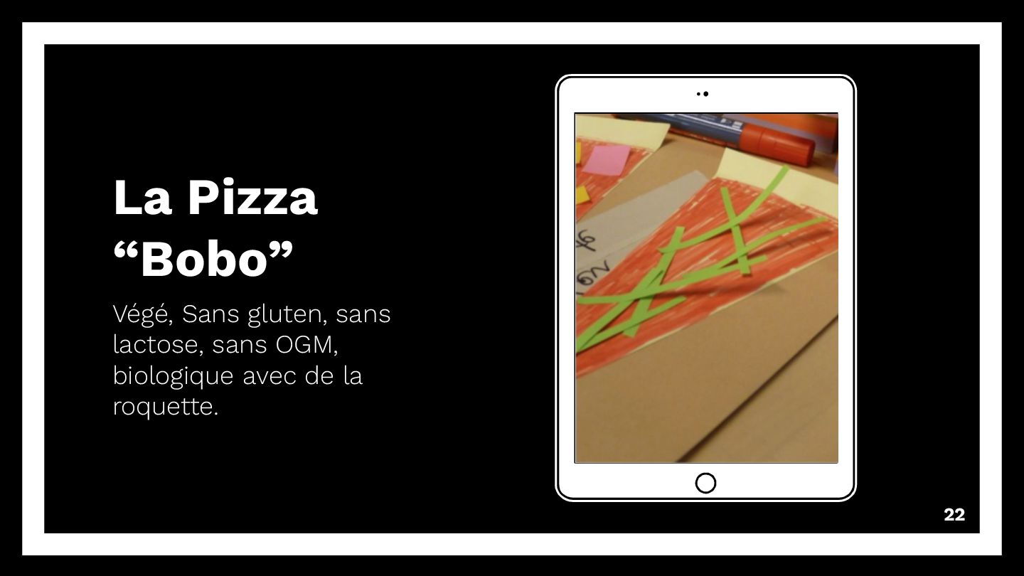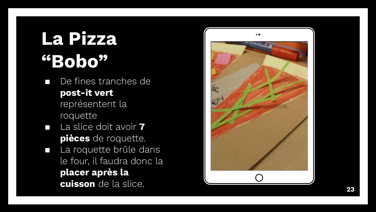 tranches de post-it vert représentent la roquette ▪ La slice doit avoir 7 pièces de roquette. ▪ La roquette brûle dans le four, il faudra donc la placer après la cuisson de la slice. 23
