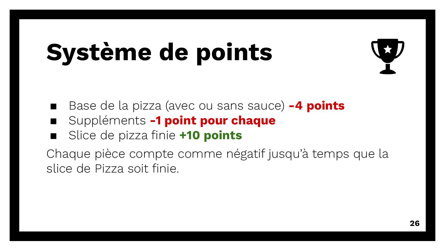 sans sauce) -4 points ▪ Suppléments -1 point pour chaque ▪ Slice de pizza finie +10 points Chaque pièce compte comme négatif jusqu’à temps que la slice de Pizza soit finie. 26