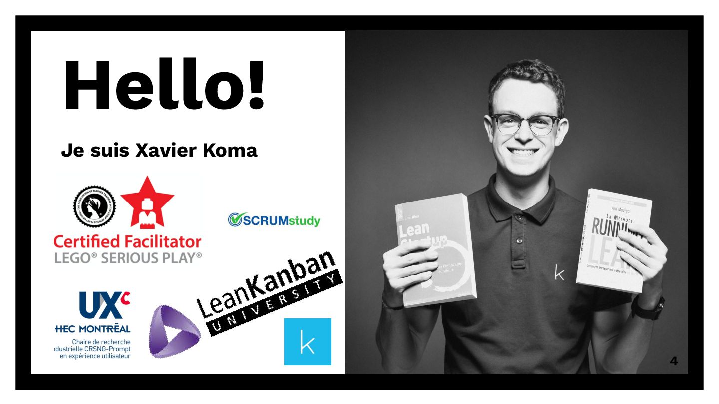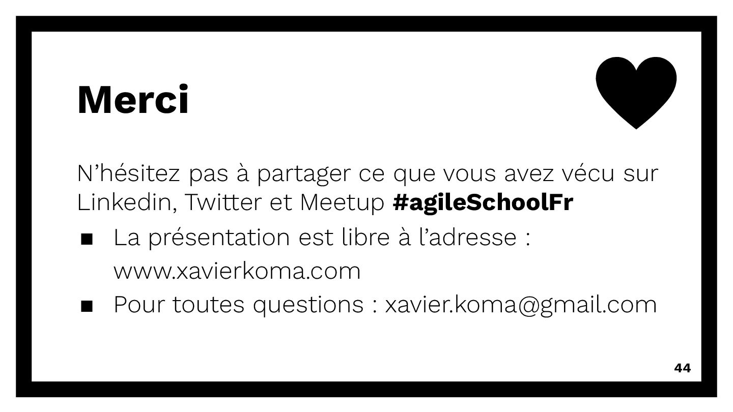sur Linkedin, Twitter et Meetup #agileSchoolFr ▪ La présentation est libre à l’adresse : www.xavierkoma.com ▪ Pour toutes questions : [email protected] 44