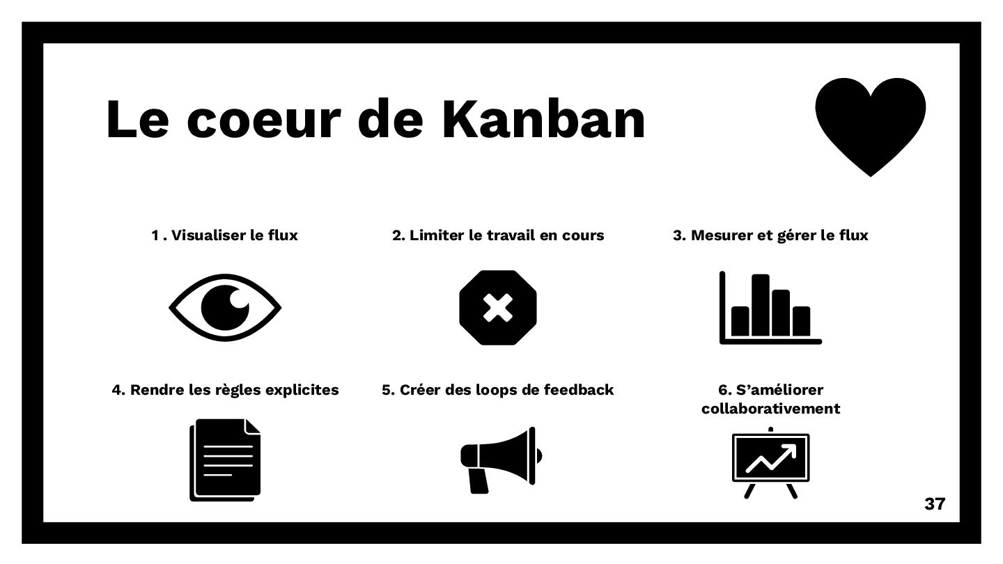 Limiter le travail en cours 3. Mesurer et gérer le flux 4. Rendre les règles explicites 5. Créer des loops de feedback 6. S’améliorer collaborativement 37