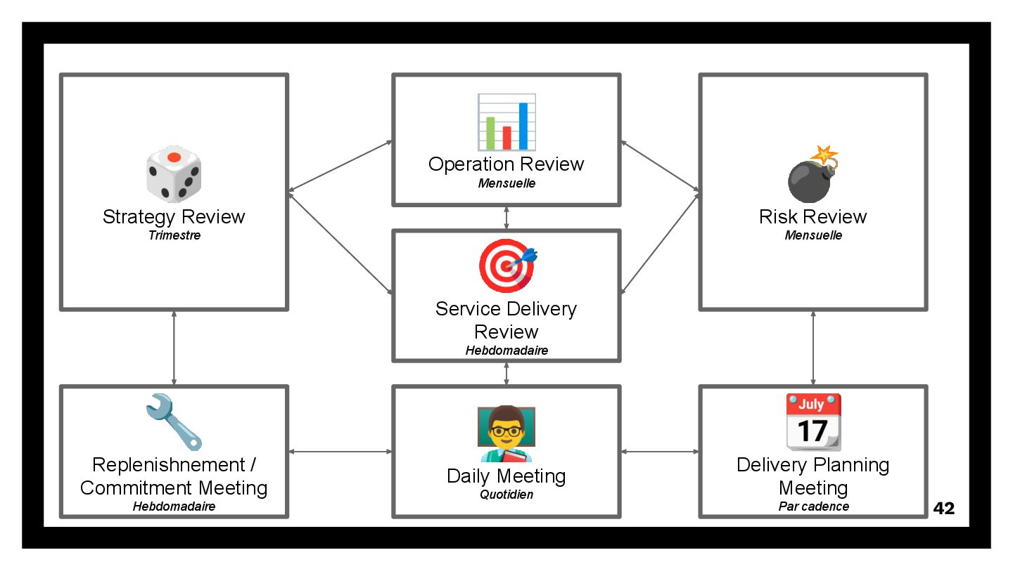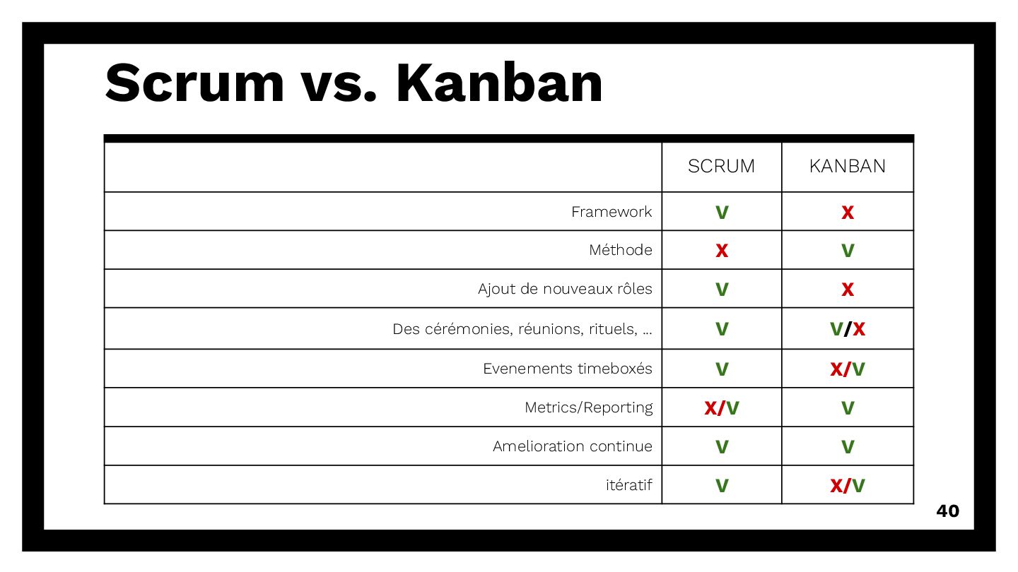 V Ajout de nouveaux rôles V X Des cérémonies, réunions, rituels, ... V V/X Evenements timeboxés V X/V Metrics/Reporting X/V V Amelioration continue V V itératif V X/V 40