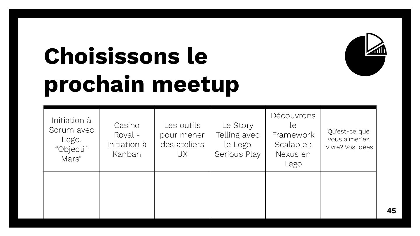Mars” Casino Royal - Initiation à Kanban Les outils pour mener des ateliers UX Le Story Telling avec le Lego Serious Play Découvrons le Framework Scalable : Nexus en Lego Qu’est-ce que vous aimeriez vivre? Vos idées 45