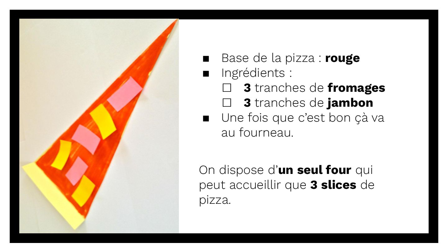 □ 3 tranches de fromages □ 3 tranches de jambon ▪ Une fois que c’est bon çà va au fourneau. On dispose d’un seul four qui peut accueillir que 3 slices de pizza.