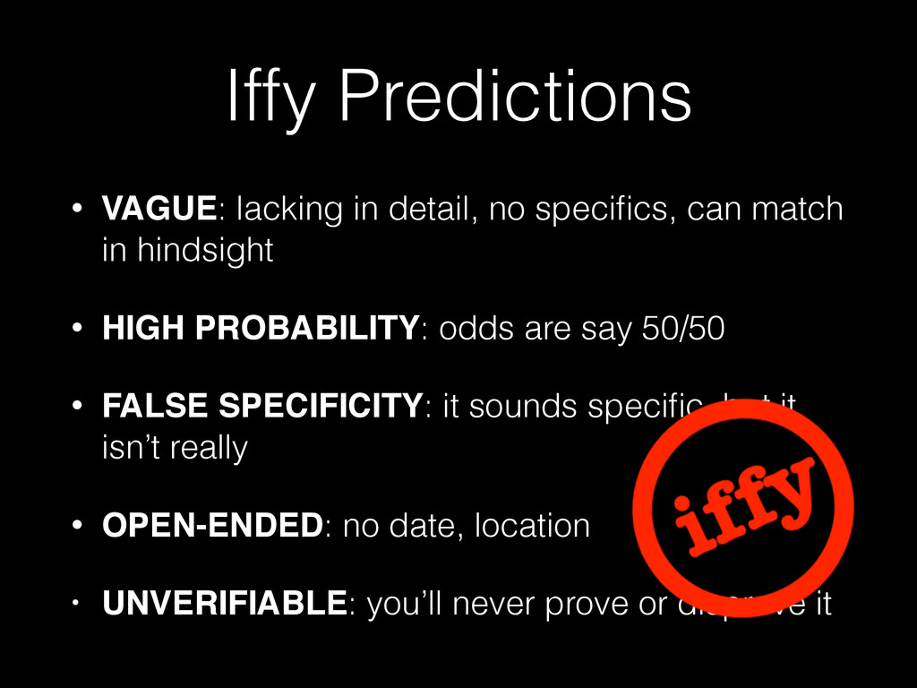 match in hindsight • HIGH PROBABILITY: odds are say 50/50 • FALSE SPECIFICITY: it sounds specific, but it isn’t really • OPEN-ENDED: no date, location • UNVERIFIABLE: you’ll never prove or disprove it