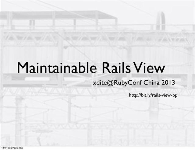 @recent_posts = @user.recent_posts.limit(5) @favorite_posts = @user.favorite_posts.limit(5) @recent_comments = @user.comments.limit(5) end end <%= render :partial => "users/recent_post", :collection => @recent_posts %> <%= render :partial => "users/favorite_post", :collection => @favorite_posts %> <%= render :partial => "users/recent_comment", :collection => @recent_comments %> Before 13年10月27⽇日星期⽇日
