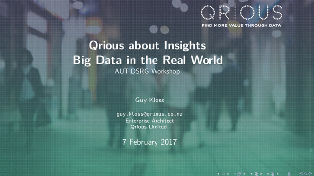 up a Solution Flotsam and Jetsam Who am I? Chemical Engineer (Masters) Rocket Scientist (German Aerospace Centre) Computer Scientist (PhD) Former lecturer (AUT) Lead Software Developer and Head Crypto Geek @ Mega Enterprise Architect at Qrious Dad, baseballer, diver, . . . general geek! Guy Kloss | Big Data in the Real World 6/41