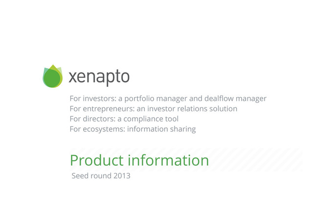 of delivery The Xenapto team › An experienced team from a variety of backgrounds › Excellent incubation environment with Anthemis Group: expertise on tap Sean Park Executive Chairman Founder of Anthemis Group, investor in innovative companies such as Betfair, The Climate Corporation and Bank Simple, and author of The Park Paradigm. Sean's initial vision of an investor's toolkit ultimately led to the growth of Xenapto Dominic Sayers Founder Former head of technology for the corporate finance division of an international investment bank, Dominic has a wealth of experience in tools for capital raising and investor relations. Pascale Dixon, Advisor Naoshir Vachha, Director & Legal Advisor Gianni Cara, Marketer Oozou, Developer Oozou have a long relationship with the founding team. They are experienced web and mobile developers with a track record of delivering high- quality apps with an emphasis on elegant design. Data-driven marketer with a Masters Degree from ESCP, and previous experiences on a marketing agency and a media/events startup in Brazil. Head of Investor Relations at Anthemis Group. LLB Hons in French and English Law & Postgraduate Diploma in Legal Practice. Anthemis Group General Counsel. Formerly a corporate lawyer at Lawrence Graham LLP, where he advised a range of private and public company clients on corporate M&A.