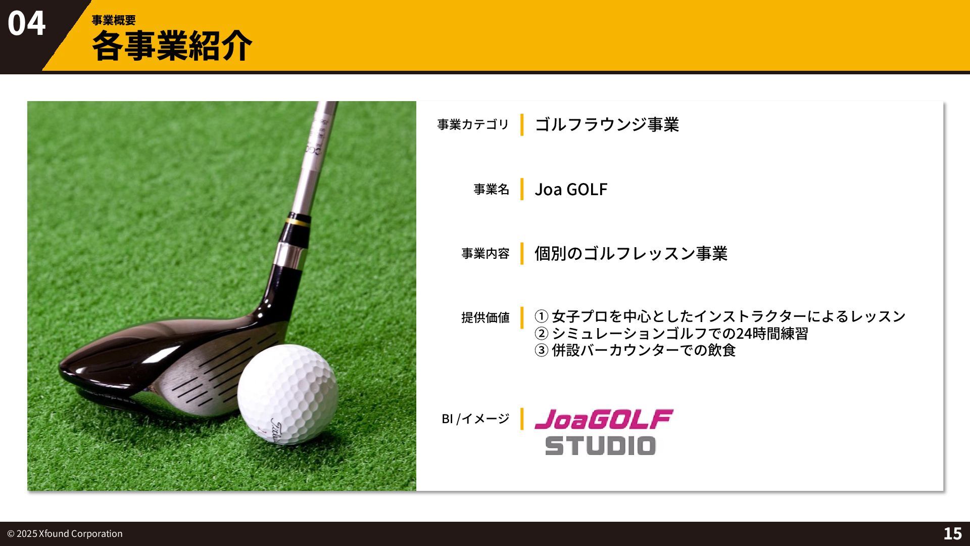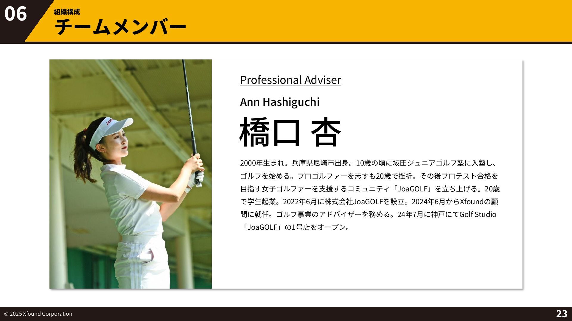 Ann Hashiguchi 2000年生まれ。兵庫県尼崎市出身。10歳の頃に坂田ジュニアゴルフ塾に入塾し、 ゴルフを始める。プロゴルファーを志すも20歳で挫折。その後プロテスト合格を 目指す女子ゴルファーを支援するコミュニティ「JoaGOLF」を立ち上げる。20歳 で学生起業。2022年6月に株式会社JoaGOLFを設立。2024年6月からXfoundの顧 問に就任。ゴルフ事業のアドバイザーを務める。24年7月に神戸にてGolf Studio 「JoaGOLF」の1号店をオープン。 Professional Adviser