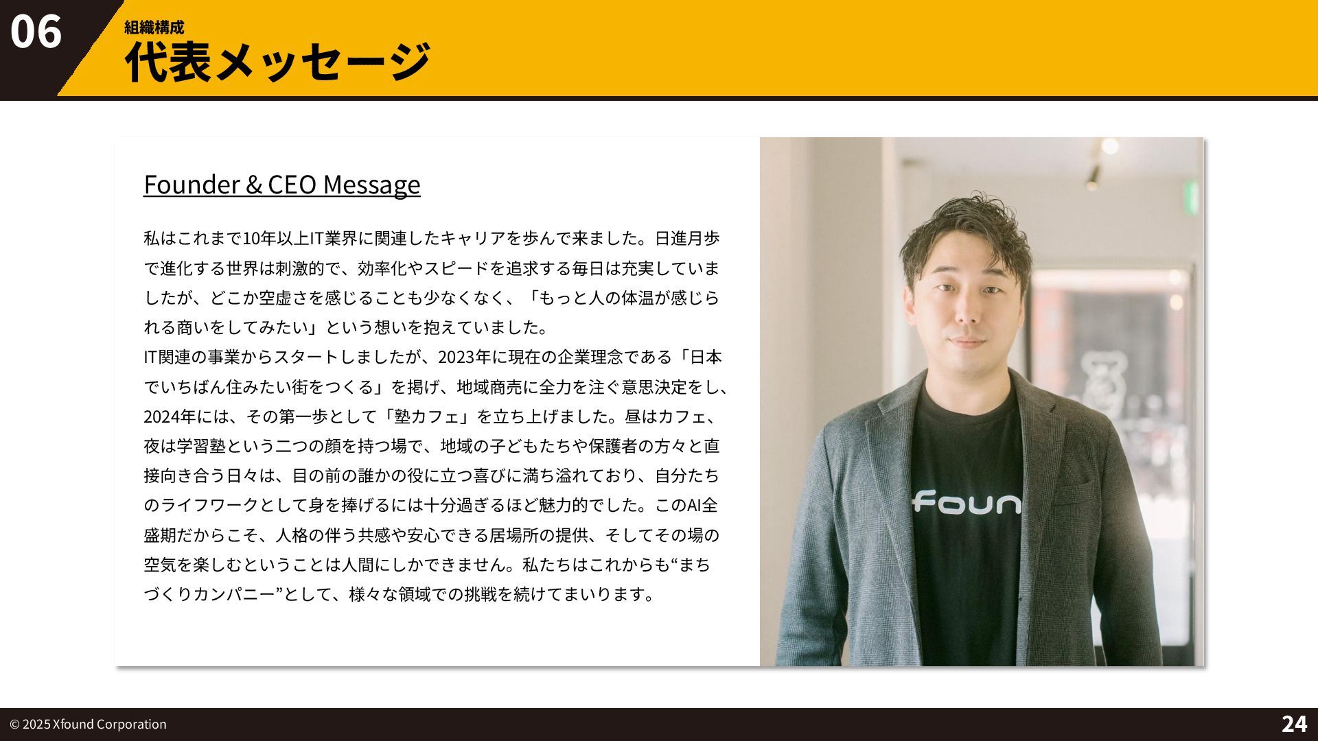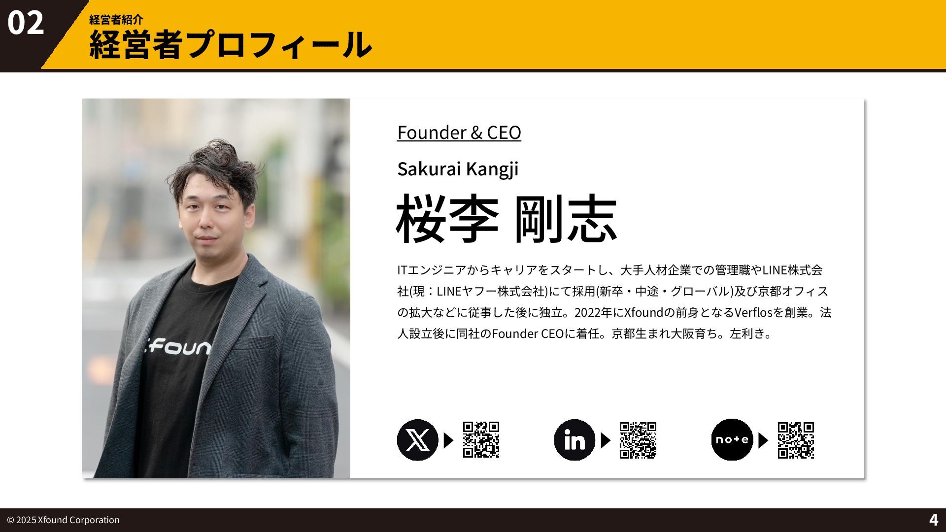 Koki Akiyama プラント設計士としてキャリアをスタートし、8年間全国の発電設備を担当。当時 ご縁があったボディチューニングの師匠から身体操作の調整技術を学ぶ為にFC活 動を開始。その後、身体の設計士として「ReCLEAR」を立ち上げ、独立する。 2025年8月にXfoundへ入社し、リラクゼーション事業と中古車情報事業を統括す る事業本部長に着任。穏やか人柄とは裏腹にパーティーが好き。 VP of Relaxation