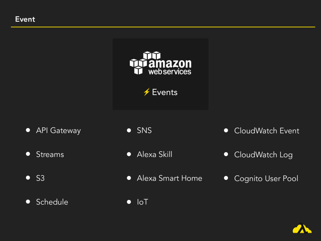 Event • API Gateway • Streams • S3 • Schedule