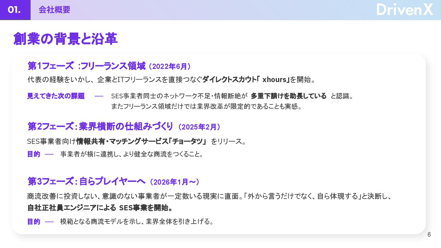 第3フェーズ:自らプレイヤーへ (2026年1月〜) 商流改善に投資しない、意識のない事業者が一定数いる現実に直面。「外から言うだけでなく、自ら体現する」と決断し、 自社正社員エンジニアによる SES事業を開始。