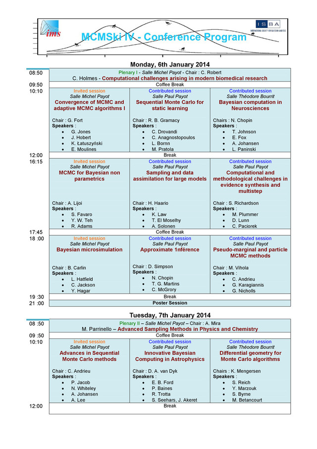 Payot - Chair : C. Robert C. Holmes - Computational challenges arising in modern biomedical research 09:50 Coffee Break 10:10 Invited session Salle Michel Payot Convergence of MCMC and adaptive MCMC algorithms I Chair : G. Fort Speakers : G. Jones J. Hobert K. Łatuszyński E. Moulines Contributed session Salle Paul Payot Sequential Monte Carlo for static learning Chair : R. B. Gramacy Speakers : C. Drovandi C. Anagnostopoulos L. Bornn M. Pratola Contributed session Salle Théodore Bourrit Bayesian computation in Neurosciences Chairs : N. Chopin Speakers : T. Johnson E. Fox A. Johansen L. Paninski 12:00 Break 16:15 Invited session Salle Michel Payot MCMC for Bayesian non parametrics Chair : A. Lijoi Speakers : S. Favaro Y. W. Teh R. Adams Contributed session Salle Paul Payot Sampling and data assimilation for large models Chair : H. Haario Speakers : K. Law T. El Moselhy A. Solonen Contributed session Salle Paul Payot Computational and methodological challenges in evidence synthesis and multistep Chair : S. Richardson Speakers : M. Plummer D. Lunn C. Paciorek 17:45 Coffee Break 18 :00 Invited session Salle Michel Payot Bayesian microsimulation Chair : B. Carlin Speakers : L. Hatfield C. Jackson Y. Hagar Contributed session Salle Paul Payot Approximate 1nférence Chair : D. Simpson Speakers : N. Chopin T. G. Martins C. McGrory Contributed session Salle Paul Payot Pseudo-marginal and particle MCMC methods Chair : M. Vihola Speakers : C. Andrieu G. Karagiannis G. Nicholls 19 :30 Break 21 :00 Poster Session Tuesday, 7th January 2014 08 :50 Plenary II – Salle Michel Payot – Chair : A. Mira M. Parrinello – Advanced Sampling Methods in Physics and Chemistry 09 :50 Coffee Break 10:10 Invited session Salle Michel Payot Advances in Sequential Monte Carlo methods Chair : C. Andrieu Speakers : P. Jacob N. Whiteley A. Johansen A. Lee Contributed session Salle Paul Payot Innovative Bayesian Computing in Astrophysics Chair : D. A. van Dyk Speakers : E. B. Ford P. Baines R. Trotta S. Seehars, J. Akeret Contributed session Salle Théodore Bourrit Differential geometry for Monte Carlo algorithms Chairs : K. Mengersen Speakers : S. Reich Y. Marzouk S. Byrne M. Betancourt 12:00 Break