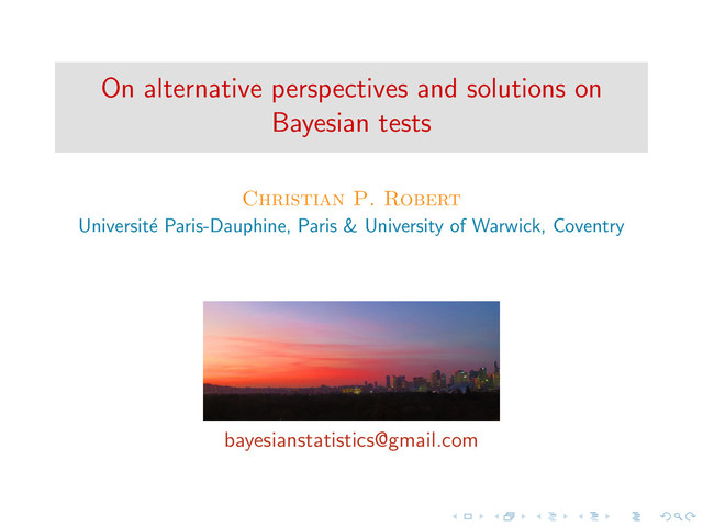 result (...) burdens proponents of the Bayesian practice”. [Lad, 2003] official version, opposing frequentist and Bayesian assessments [Lindley, 1957] intra-Bayesian version, blaming vague and improper priors for the Bayes factor misbehaviour: if π1(·|σ) depends on a scale parameter σ, it is often the case that B01(x) σ−→∞ −→ +∞ for a given x, meaning H0 is always accepted [Robert, 1992, 2013]