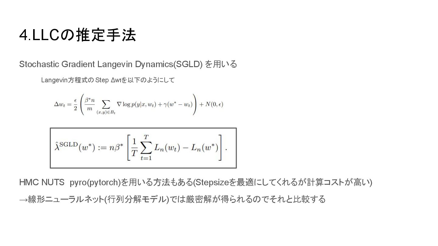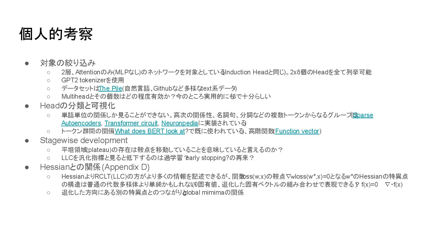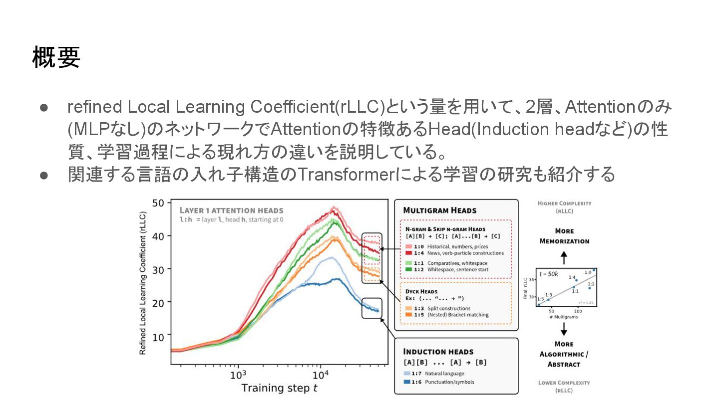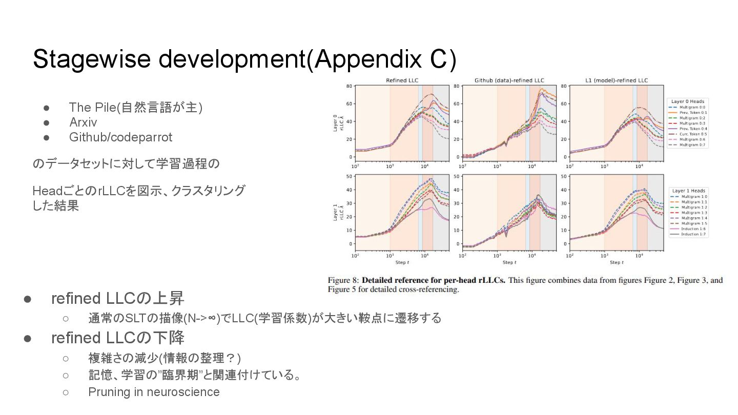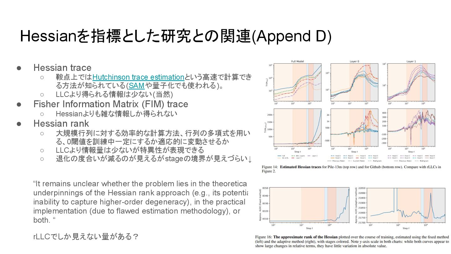 ◦ LLCより得られる情報は少ない(当然) • Fisher Information Matrix (FIM) trace ◦ Hessianよりも雑な情報しか得られない • Hessian rank ◦ 大規模行列に対する効率的な計算方法、行列の多項式を用い る、0閾値を訓練中一定にするか適応的に変動させるか ◦ LLCより情報量は少ないが特異性が表現できる ◦ 退化の度合いが減るのが見えるがstageの境界が見えづらい↓ “It remains unclear whether the problem lies in the theoretical underpinnings of the Hessian rank approach (e.g., its potential inability to capture higher-order degeneracy), in the practical implementation (due to flawed estimation methodology), or both. “ rLLCでしか見えない量がある?