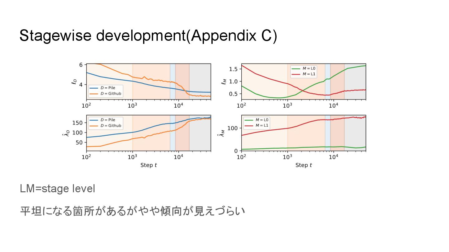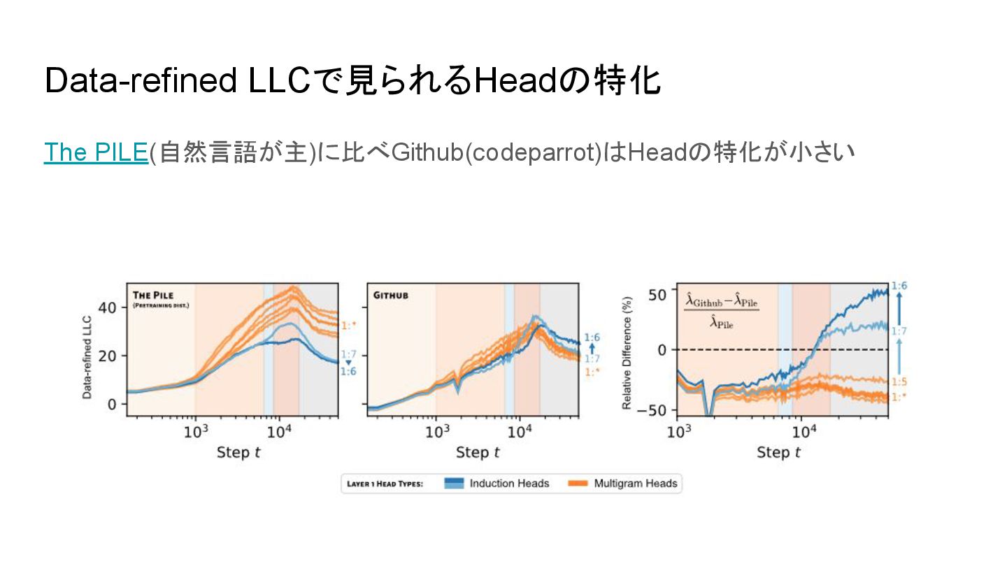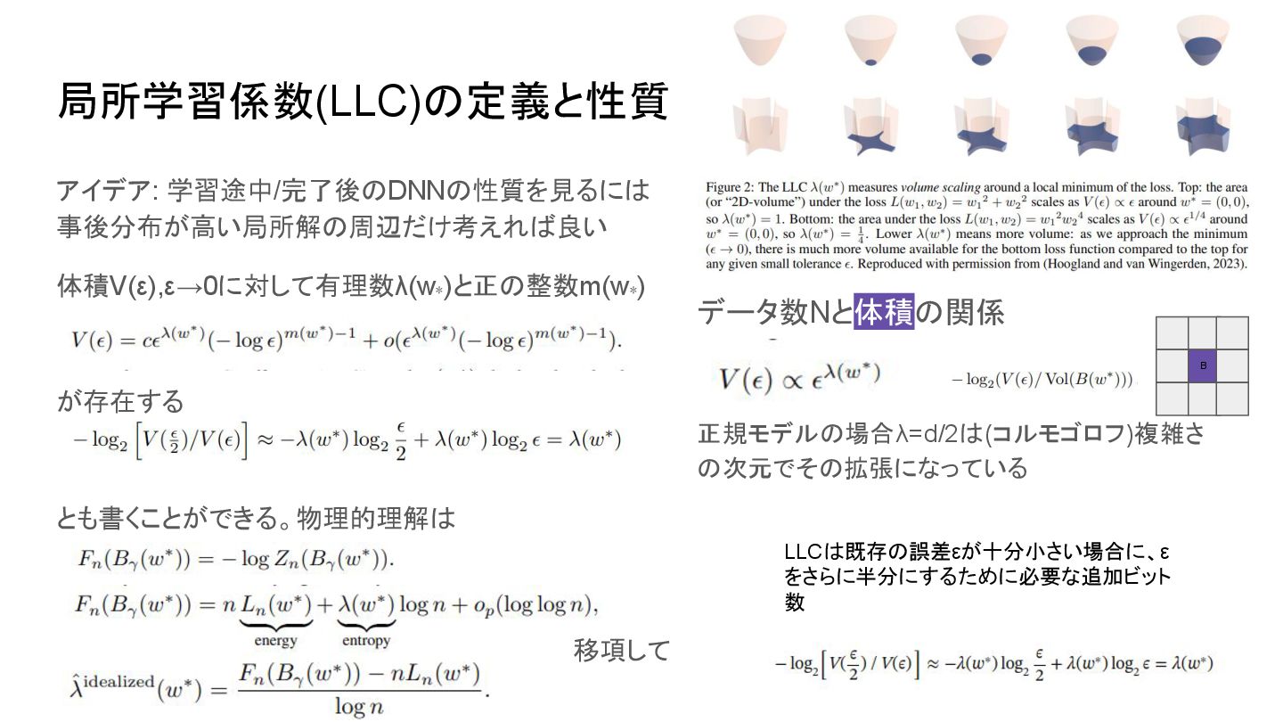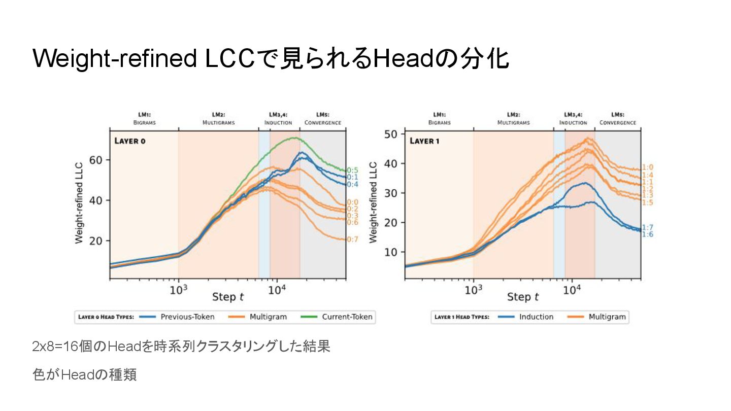 ◦ LLCより得られる情報は少ない(当然) • Fisher Information Matrix (FIM) trace ◦ Hessianよりも雑な情報しか得られない • Hessian rank ◦ 大規模行列に対する効率的な計算方法、行列の多項式を用い る、0閾値を訓練中一定にするか適応的に変動させるか ◦ LLCより情報量は少ないが特異性が表現できる ◦ 退化の度合いが減るのが見えるがstageの境界が見えづらい↓ “It remains unclear whether the problem lies in the theoretical underpinnings of the Hessian rank approach (e.g., its potential inability to capture higher-order degeneracy), in the practical implementation (due to flawed estimation methodology), or both. “ rLLCでしか見えない量がある?