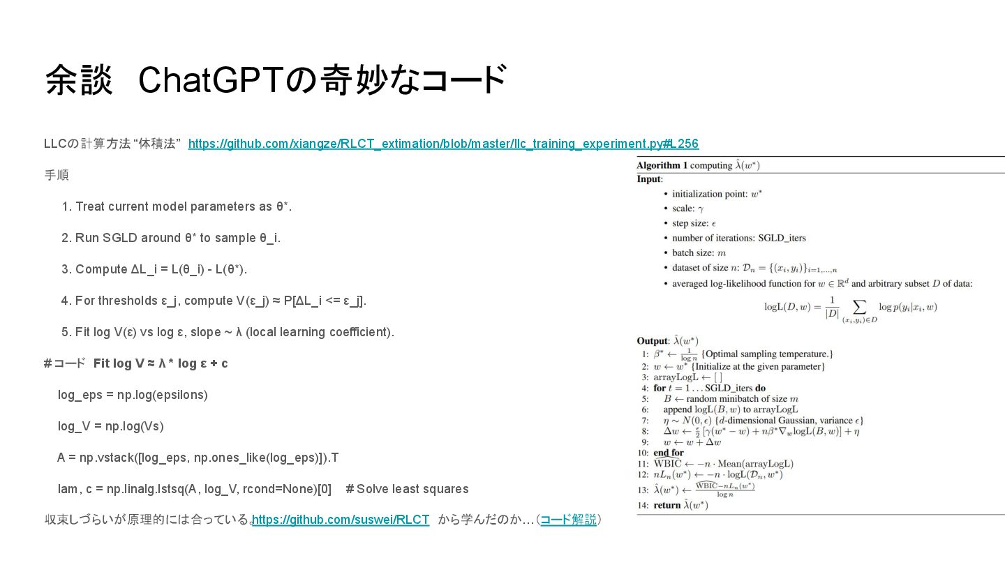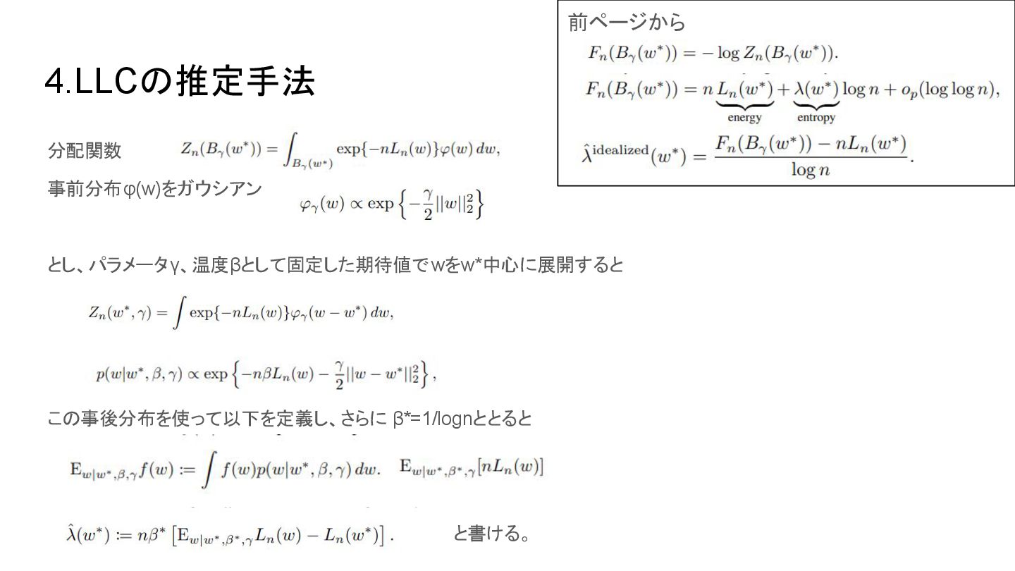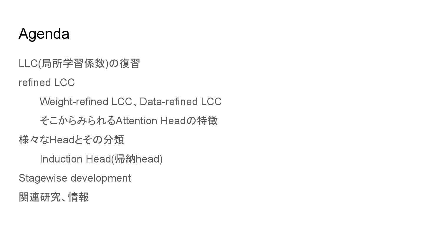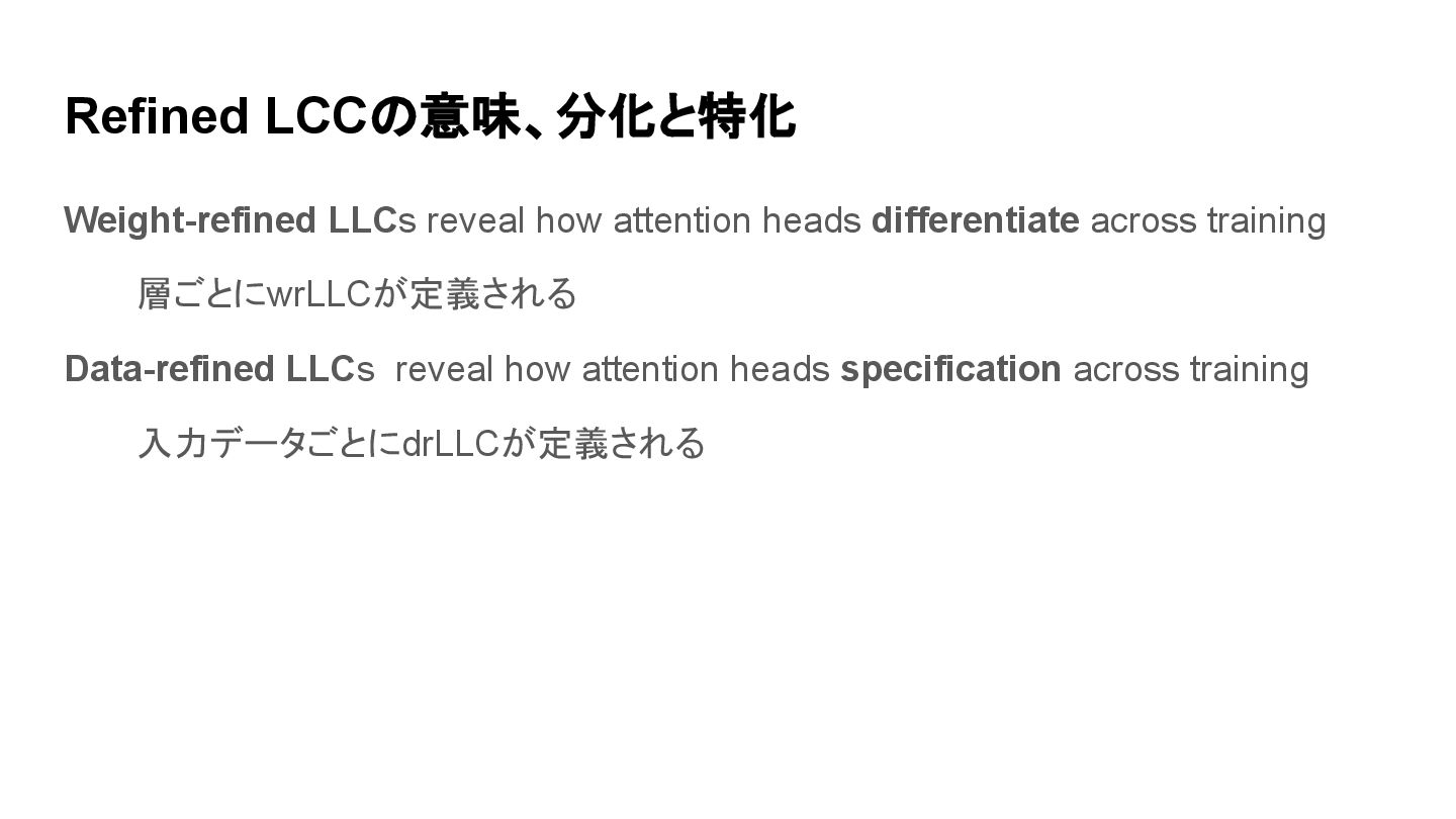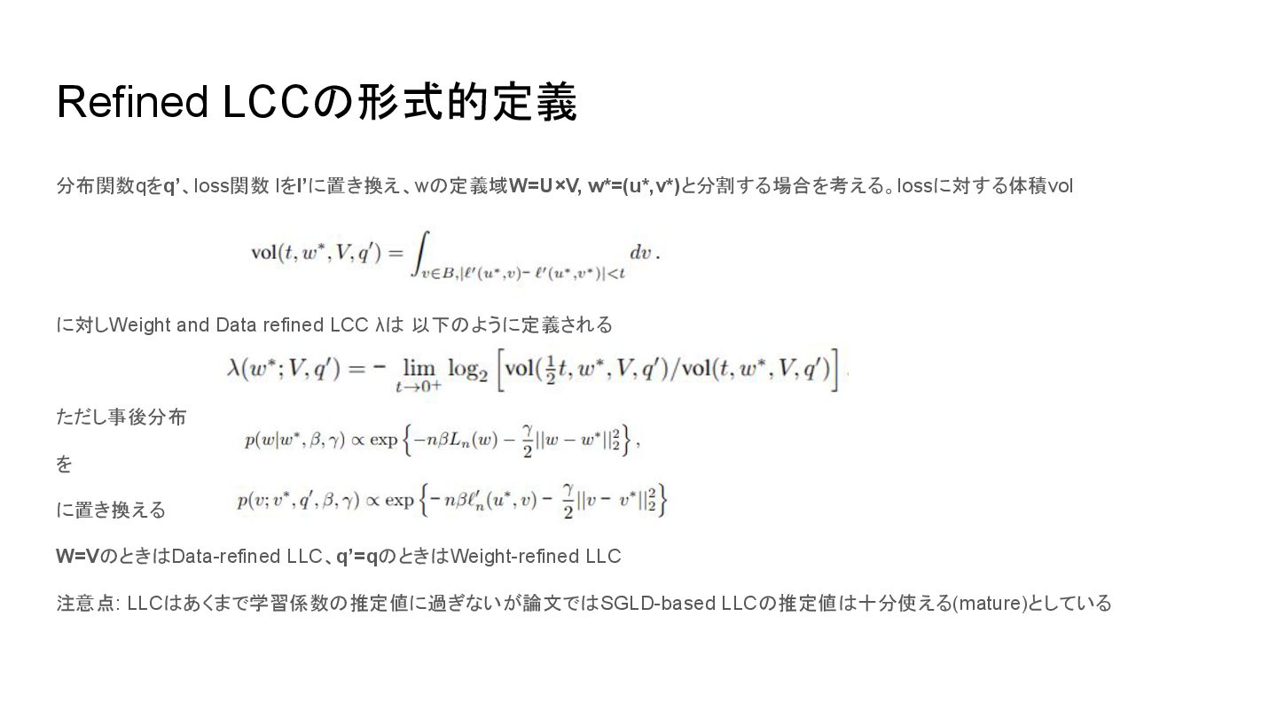 ◦ LLCより得られる情報は少ない(当然) • Fisher Information Matrix (FIM) trace ◦ Hessianよりも雑な情報しか得られない • Hessian rank ◦ 大規模行列に対する効率的な計算方法、行列の多項式を用い る、0閾値を訓練中一定にするか適応的に変動させるか ◦ LLCより情報量は少ないが特異性が表現できる ◦ 退化の度合いが減るのが見えるがstageの境界が見えづらい↓ “It remains unclear whether the problem lies in the theoretical underpinnings of the Hessian rank approach (e.g., its potential inability to capture higher-order degeneracy), in the practical implementation (due to flawed estimation methodology), or both. “ rLLCでしか見えない量がある?