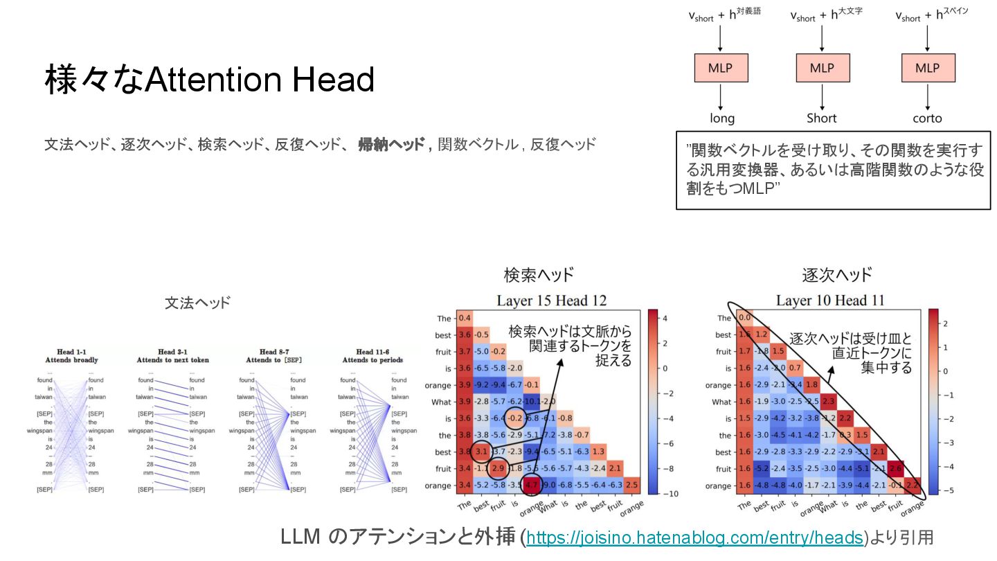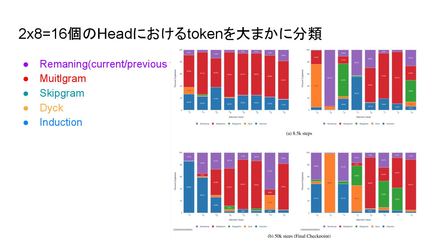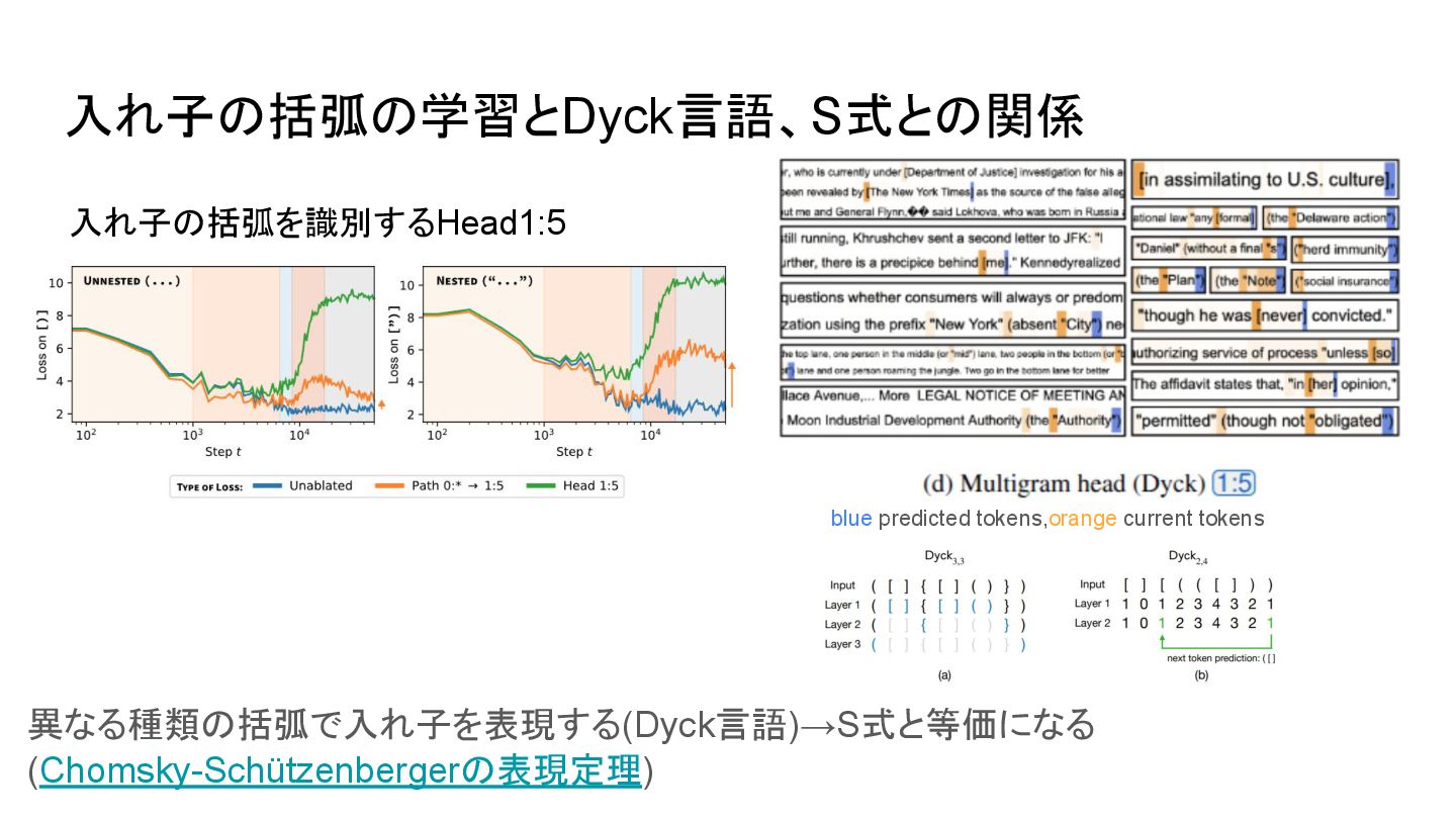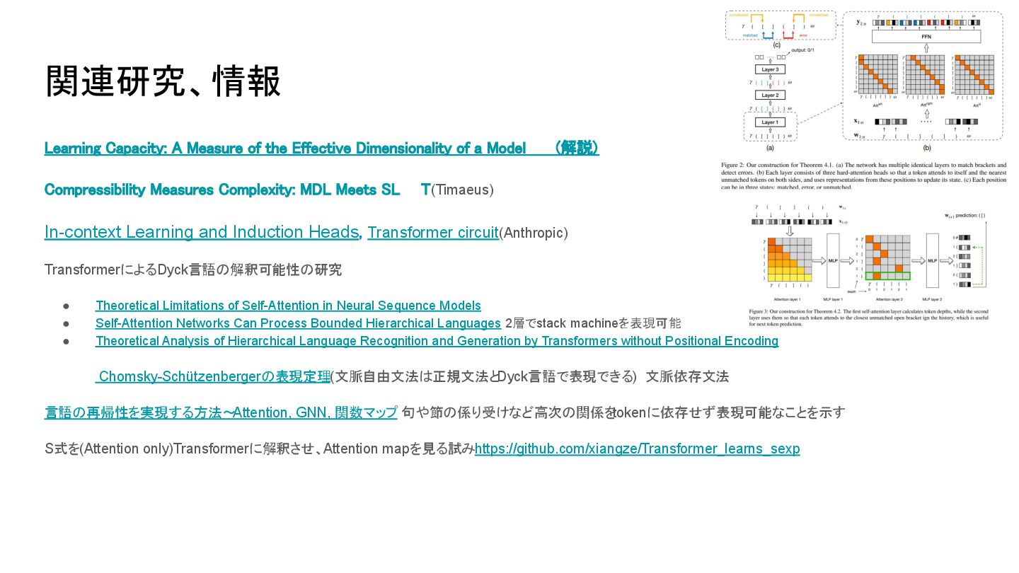 a Model (解説) Compressibility Measures Complexity: MDL Meets SL T(Timaeus) In-context Learning and Induction Heads, Transformer circuit(Anthropic) TransformerによるDyck言語の解釈可能性の研究 • Theoretical Limitations of Self-Attention in Neural Sequence Models • Self-Attention Networks Can Process Bounded Hierarchical Languages 2層でstack machineを表現可能 • Theoretical Analysis of Hierarchical Language Recognition and Generation by Transformers without Positional Encoding Chomsky-Schützenbergerの表現定理(文脈自由文法は正規文法とDyck言語で表現できる) 文脈依存文法 言語の再帰性を実現する方法〜 Attention, GNN, 関数マップ 句や節の係り受けなど高次の関係を tokenに依存せず表現可能なことを示す S式を(Attention only)Transformerに解釈させ、Attention mapを見る試みhttps://github.com/xiangze/Transformer_learns_sexp