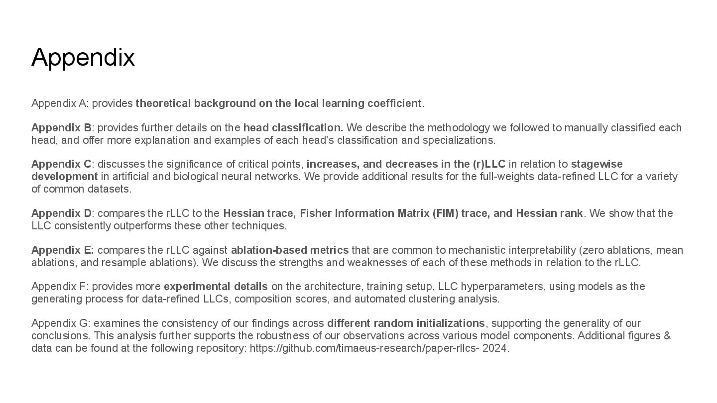 coefficient. Appendix B: provides further details on the head classification. We describe the methodology we followed to manually classified each head, and offer more explanation and examples of each head’s classification and specializations. Appendix C: discusses the significance of critical points, increases, and decreases in the (r)LLC in relation to stagewise development in artificial and biological neural networks. We provide additional results for the full-weights data-refined LLC for a variety of common datasets. Appendix D: compares the rLLC to the Hessian trace, Fisher Information Matrix (FIM) trace, and Hessian rank. We show that the LLC consistently outperforms these other techniques. Appendix E: compares the rLLC against ablation-based metrics that are common to mechanistic interpretability (zero ablations, mean ablations, and resample ablations). We discuss the strengths and weaknesses of each of these methods in relation to the rLLC. Appendix F: provides more experimental details on the architecture, training setup, LLC hyperparameters, using models as the generating process for data-refined LLCs, composition scores, and automated clustering analysis. Appendix G: examines the consistency of our findings across different random initializations, supporting the generality of our conclusions. This analysis further supports the robustness of our observations across various model components. Additional figures & data can be found at the following repository: https://github.com/timaeus-research/paper-rllcs- 2024.