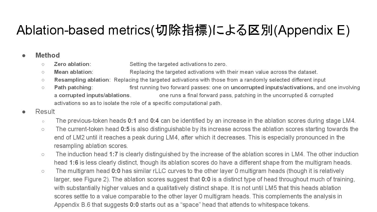 targeted activations to zero. ◦ Mean ablation: Replacing the targeted activations with their mean value across the dataset. ◦ Resampling ablation: Replacing the targeted activations with those from a randomly selected different input ◦ Path patching: first running two forward passes: one on uncorrupted inputs/activations, and one involving a corrupted inputs/ablations. one runs a final forward pass, patching in the uncorrupted & corrupted activations so as to isolate the role of a specific computational path. • Result ◦ The previous-token heads 0:1 and 0:4 can be identified by an increase in the ablation scores during stage LM4. ◦ The current-token head 0:5 is also distinguishable by its increase across the ablation scores starting towards the end of LM2 until it reaches a peak during LM4, after which it decreases. This is especially pronounced in the resampling ablation scores. ◦ The induction head 1:7 is clearly distinguished by the increase of the ablation scores in LM4. The other induction head 1:6 is less clearly distinct, though its ablation scores do have a different shape from the multigram heads. ◦ The multigram head 0:0 has similar rLLC curves to the other layer 0 multigram heads (though it is relatively larger, see Figure 2). The ablation scores suggest that 0:0 is a distinct type of head throughout much of training, with substantially higher values and a qualitatively distinct shape. It is not until LM5 that this heads ablation scores settle to a value comparable to the other layer 0 multigram heads. This complements the analysis in Appendix B.6 that suggests 0:0 starts out as a “space” head that attends to whitespace tokens.