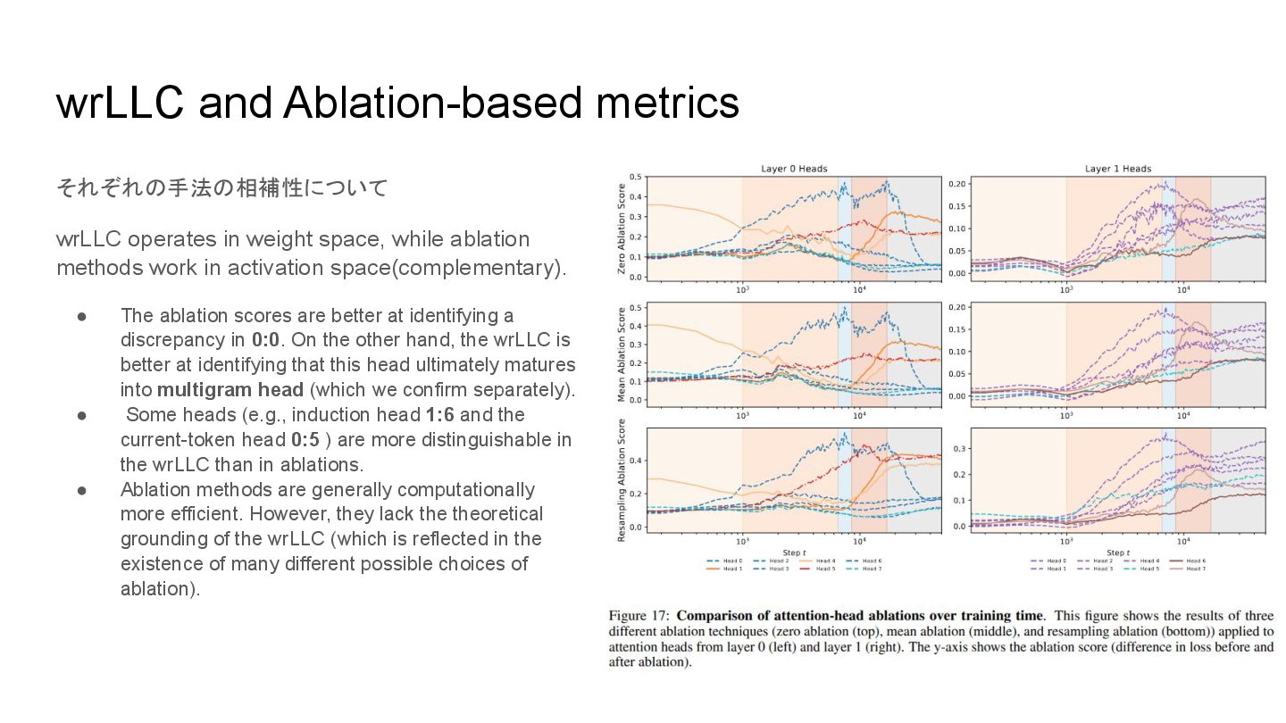 while ablation methods work in activation space(complementary). • The ablation scores are better at identifying a discrepancy in 0:0. On the other hand, the wrLLC is better at identifying that this head ultimately matures into multigram head (which we confirm separately). • Some heads (e.g., induction head 1:6 and the current-token head 0:5 ) are more distinguishable in the wrLLC than in ablations. • Ablation methods are generally computationally more efficient. However, they lack the theoretical grounding of the wrLLC (which is reflected in the existence of many different possible choices of ablation).