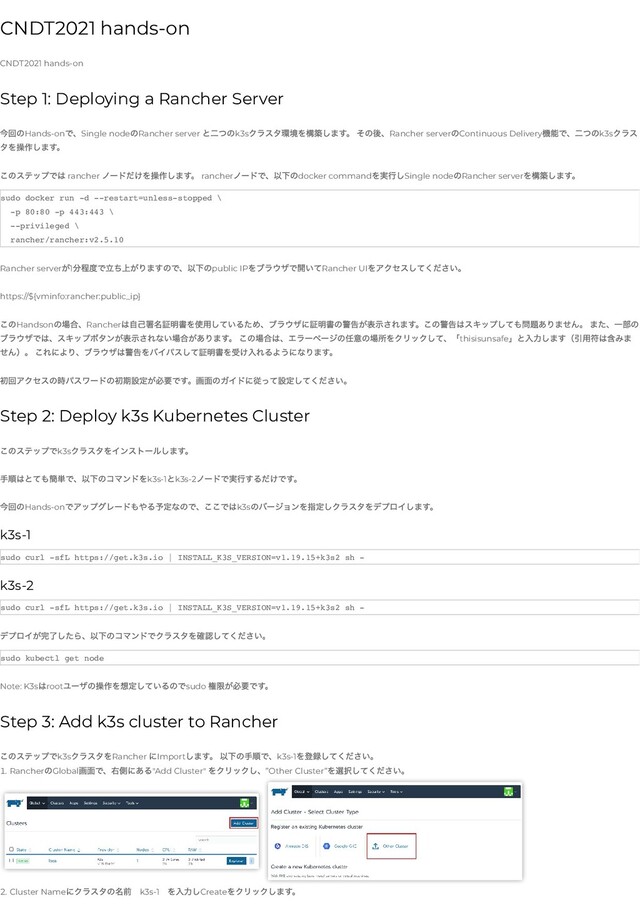 今回のHands-on で、Single node のRancher server と二つのk3s クラスタ環境を構築します。 その後、Rancher server のContinuous Delivery 機能で、二つのk3s クラス タを操作します。 このステップでは rancher ノードだけを操作します。 rancher ノードで、以下のdocker command を実行しSingle node のRancher server を構築します。 sudo docker run -d --restart=unless-stopped \ -p 80:80 -p 443:443 \ --privileged \ rancher/rancher:v2.5.10 Rancher server が1 分程度で立ち上がりますので、以下のpublic IP をブラウザで開いてRancher UI をアクセスしてください。 https://${vminfo:rancher:public_ip} このHandson の場合、Rancher は自己署名証明書を使用しているため、ブラウザに証明書の警告が表示されます。この警告はスキップしても問題ありません。 また、一部の ブラウザでは、スキップボタンが表示されない場合があります。 この場合は、エラーページの任意の場所をクリックして、「thisisunsafe 」と入力します(引用符は含みま せん)。 これにより、ブラウザは警告をバイパスして証明書を受け入れるようになります。 初回アクセスの時パスワードの初期設定が必要です。画面のガイドに従って設定してください。 Step 2: Deploy k3s Kubernetes Cluster このステップでk3s クラスタをインストールします。 手順はとても簡単で、以下のコマンドをk3s-1 とk3s-2 ノードで実行するだけです。 今回のHands-on でアップグレードもやる予定なので、ここではk3s のバージョンを指定しクラスタをデプロイします。 k3s-1 sudo curl -sfL https://get.k3s.io | INSTALL_K3S_VERSION=v1.19.15+k3s2 sh - k3s-2 sudo curl -sfL https://get.k3s.io | INSTALL_K3S_VERSION=v1.19.15+k3s2 sh - デプロイが完了したら、以下のコマンドでクラスタを確認してください。 sudo kubectl get node Note: K3s はroot ユーザの操作を想定しているのでsudo 権限が必要です。 Step 3: Add k3s cluster to Rancher このステップでk3s クラスタをRancher にImport します。 以下の手順で、k3s-1 を登録してください。 1. Rancher のGlobal 画面で、右側にある"Add Cluster" をクリックし、”Other Cluster” を選択してください。 2. Cluster Name にクラスタの名前 k3s-1 を入力しCreate をクリックします。