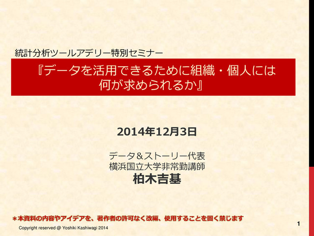 ビジネス改革マネージャ等を歴任。 グローバル組織の中で、数々の経営課題解決、変革プロジェクトのパイロットを務める。 2014年10月より、企業研修講師、コンサルタント、大学教員として独立。 著書 『Excelで学ぶ意思決定論』(オーム社) 『人は勘定より感情で決める』(技術評論社) 『明日からつかえるシンプル統計学』(技術評論社) 『「それ、根拠あるの?」と言わせない データ・統計分析ができる本』(日本実業出版社) ほか、数多くのビジネス雑誌にも登場(『日経情報ストラテジー』にて現在連載中) 柏木 吉基 かしわぎ よしき 「仕事の成果」に直結する実務データ分析トレーナー 横浜国立大学非常勤講師 データ&ストーリー代表 (http://data-story.net)