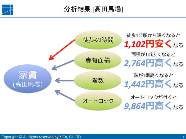 [高田馬場] 1 家賃 (⾼高⽥田⾺馬場) 徒歩の時間 専有⾯面積 階数 オートロック 徒歩1分駅から遠くなると 1,102円安くなる ⾯面積が1㎡広くなると 2,764円⾼高くなる 階が1階⾼高くなると 1,442円⾼高くなる オートロックが付くと 9,864円⾼高くなる