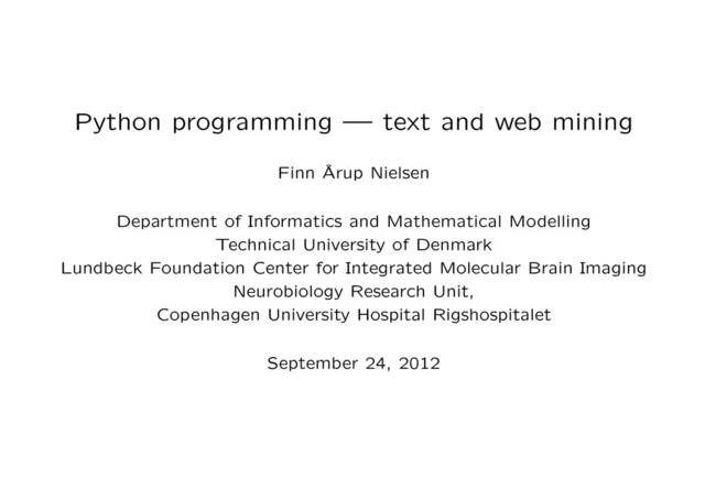 Natural Language Processing with Python. O’Reilly, Sebastopol, California. ISBN 9780596516499. Larsen, J., Hansen, L. K., Have, A. S., Christiansen, T., and Kolenda, T. (2002a). Webmin- ing: learning from the world wide web. Computational Statistics & Data Analysis, 38(4):517–532. DOI: 10.1016/S0167-9473(01)00076-7. Larsen, J., Szymkowiak, A., and Hansen, L. K. (2002b). Probabilistic hierarchical clustering with labeled and unlabeled data. International Journal of Knowledge-Based Intelligent Engineering Systems, 6(1):56– 62. http://isp.imm.dtu.dk/publications/2001/larsen.kes.pdf. Martelli, A. (2006). Python in a Nutshell. In a Nutshell. O’Reilly, Sebastopol, California, second edition. Martelli, A., Ravenscroft, A. M., and Ascher, D., editors (2005). Python Cookbook. O’Reilly, Sebastopol, California, 2nd edition. Nielsen, F. ˚ A. (2003). The Brede database: a small database for functional neuroimaging. NeuroImage, 19(2). http://www2.imm.dtu.dk/pubdb/views/edoc download.php/2879/pdf/imm2879.pdf. Presented at the 9th International Conference on Functional Mapping of the Human Brain, June 19–22, 2003, New York, NY. Available on CD-Rom. Pilgrim, M. (2004). Dive into Python. Segaran, T. (2007). Programming Collective Intelligence. O’Reilly, Sebastopol, California. Szymkowiak, A., Larsen, J., and Hansen, L. K. (2001). Hierarchical clustering for datamining. In Babs, N., Jain, L. C., and Howlett, R. J., editors, Proceedings of KES-2001 Fifth International Conference on Knowledge-Based Intelligent Information Engineering Systems & Allied Technologies, pages 261–265. http://isp.imm.dtu.dk/publications/2001/szymkowiak.kes2001.pdf. Szymkowiak-Have, A., Girolami, M. A., and Larsen, J. (2006). Clustering via kernel decomposition. IEEE Transactions on Neural Networks, 17(1):256–264. http://eprints.gla.ac.uk/3682/01/symoviak3682.pdf. Finn ˚ Arup Nielsen 54 September 24, 2012