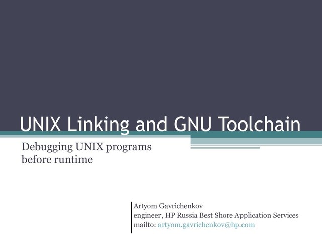 external function or library during compilation ▫ Runtime linker offers the dlopen() mechanism • Example: • Links: ▫ http://www.opengroup.org/onlinepubs/009695399/basedefs/dlf cn.h.html ▫ http://tldp.org/HOWTO/C++-dlopen/ /* open the needed object */ handle = dlopen("/usr/home/me/libfoo.so", RTLD_LOCAL); /* find the address of function objects */ *(void **)(&fptr) = dlsym(handle, "my_function"); /* invoke function, passing value of integer as a parameter */ (*fptr)(42);