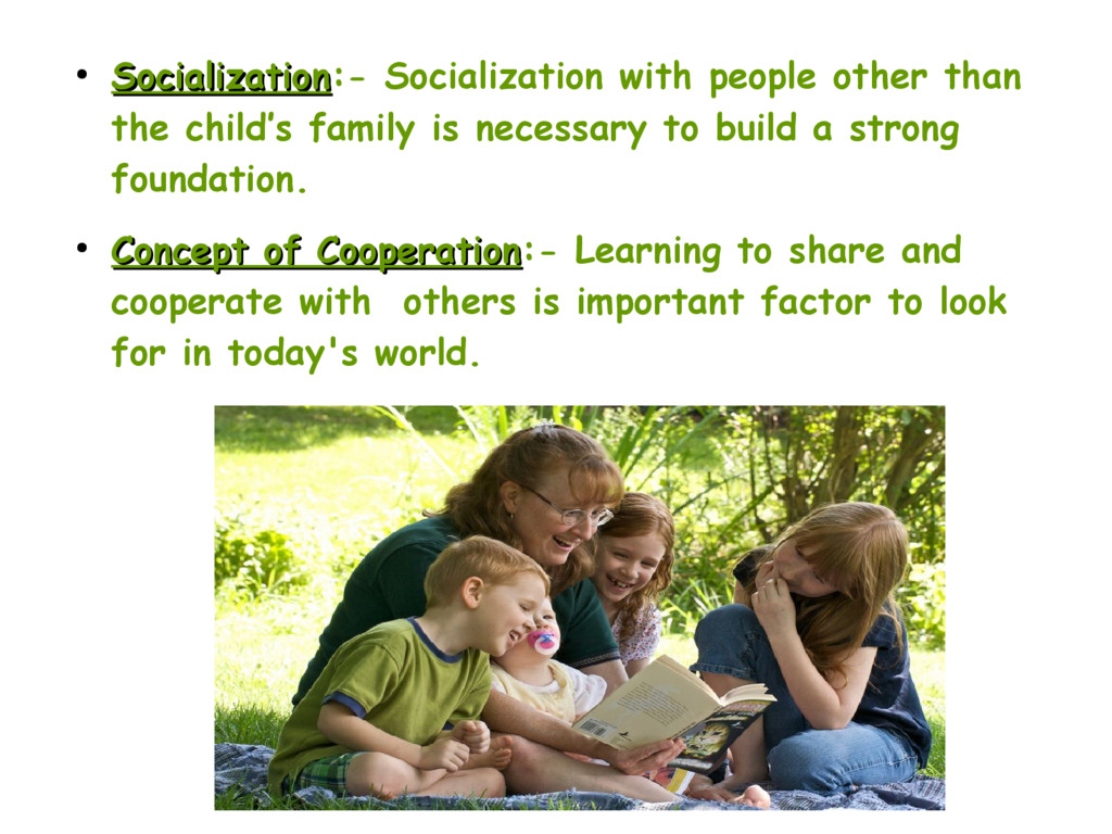 family is necessary to build a strong foundation. • Concept of Cooperation Concept of Cooperation:- Learning to share and cooperate with others is important factor to look for in today's world.