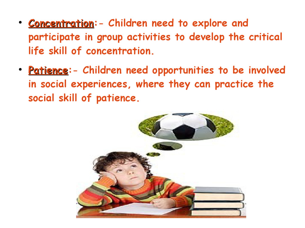 group activities to develop the critical life skill of concentration. • Patience Patience:- Children need opportunities to be involved in social experiences, where they can practice the social skill of patience.
