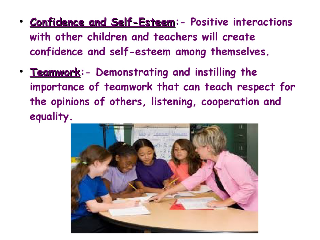 other children and teachers will create confidence and self-esteem among themselves. • Teamwork Teamwork:- Demonstrating and instilling the importance of teamwork that can teach respect for the opinions of others, listening, cooperation and equality.