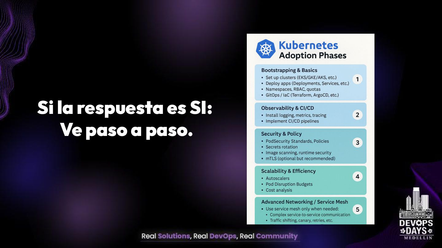 A través de casos reales y lecciones aprendidas (a veces dolorosamente), compartiré estrategias que han funcionado en entornos productivos complejos. Exploraremos tanto los aspectos técnicos como los organizacionales: configuración óptima de recursos, patrones de tolerancia a fallos y cómo fomentar una cultura de mejora continua.