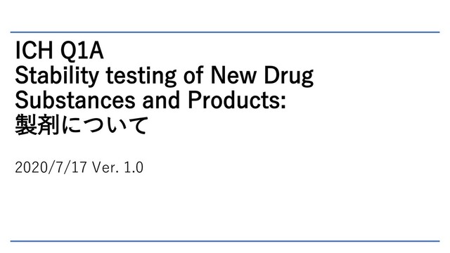 ICH Q1Aは未承認の新規有効成分とそれを使用した新規製剤の安定性試験についてのガイドラインです。このスライドでは製剤の安定性試験について説明します。