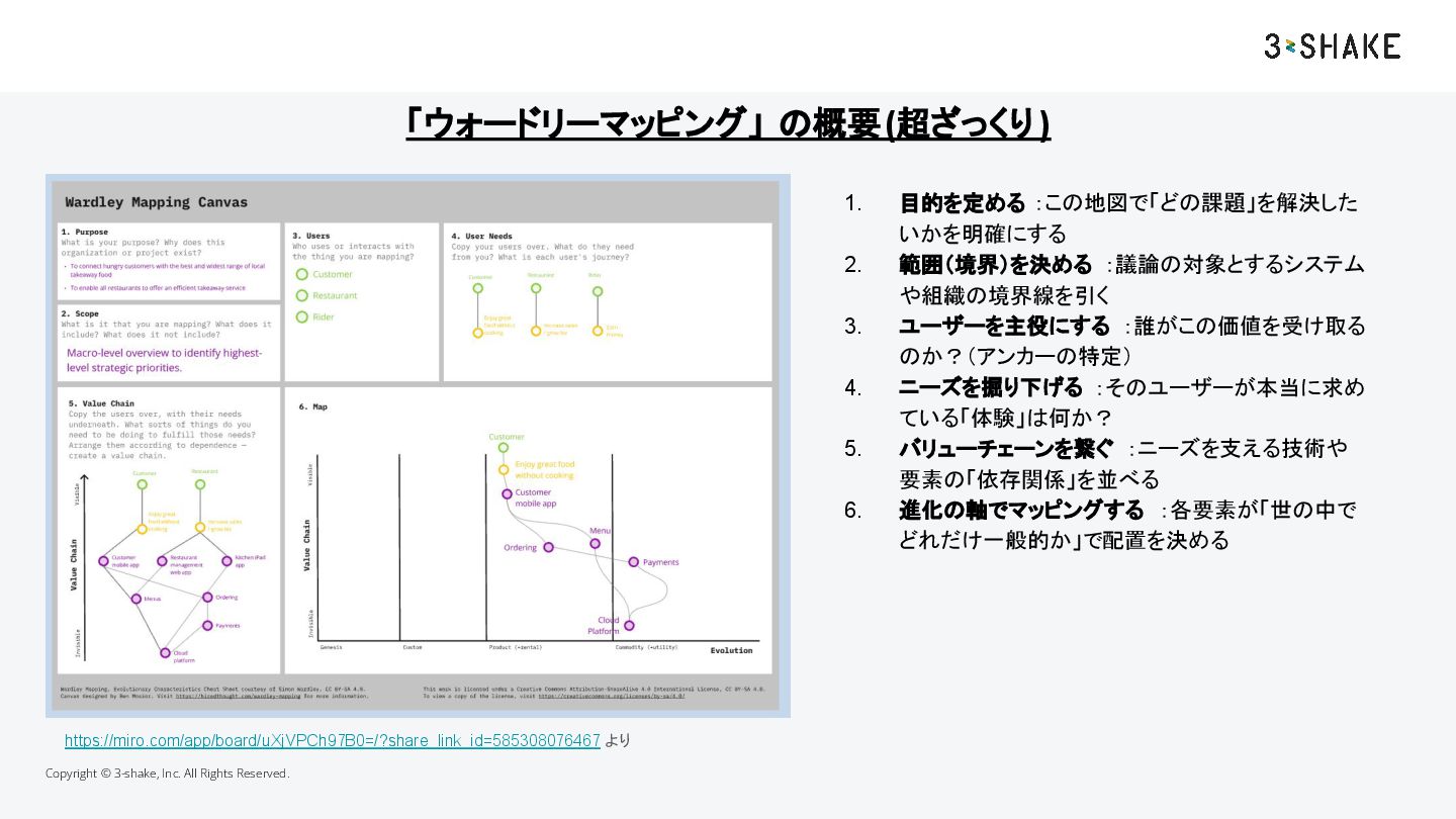 https://miro.com/app/board/uXjVPCh97B0=/?share_link_id=585308076467 より 1. 目的を定める :この地図で「どの課題」を解決した いかを明確にする 2. 範囲(境界)を決める :議論の対象とするシステム や組織の境界線を引く 3. ユーザーを主役にする :誰がこの価値を受け取る のか?(アンカーの特定) 4. ニーズを掘り下げる :そのユーザーが本当に求め ている「体験」は何か? 5. バリューチェーンを繋ぐ :ニーズを支える技術や 要素の「依存関係」を並べる 6. 進化の軸でマッピングする :各要素が「世の中で どれだけ一般的か」で配置を決める ちゃんとやるとめちゃくちゃ時間かかるし大変そう!!