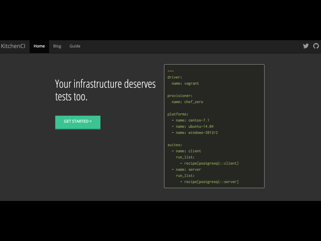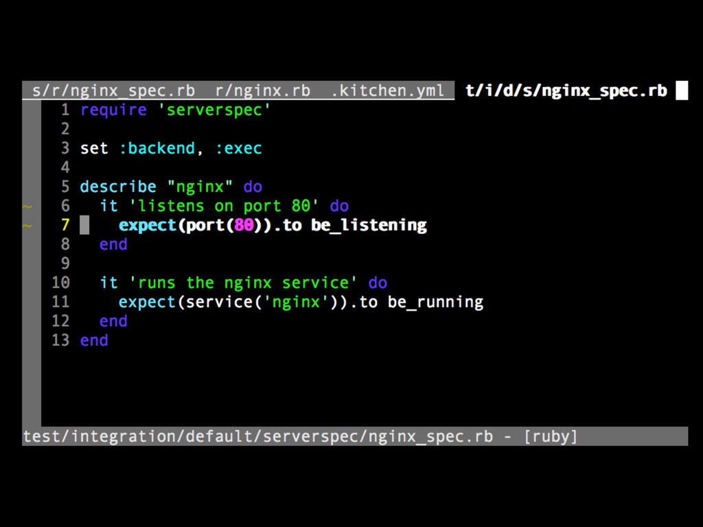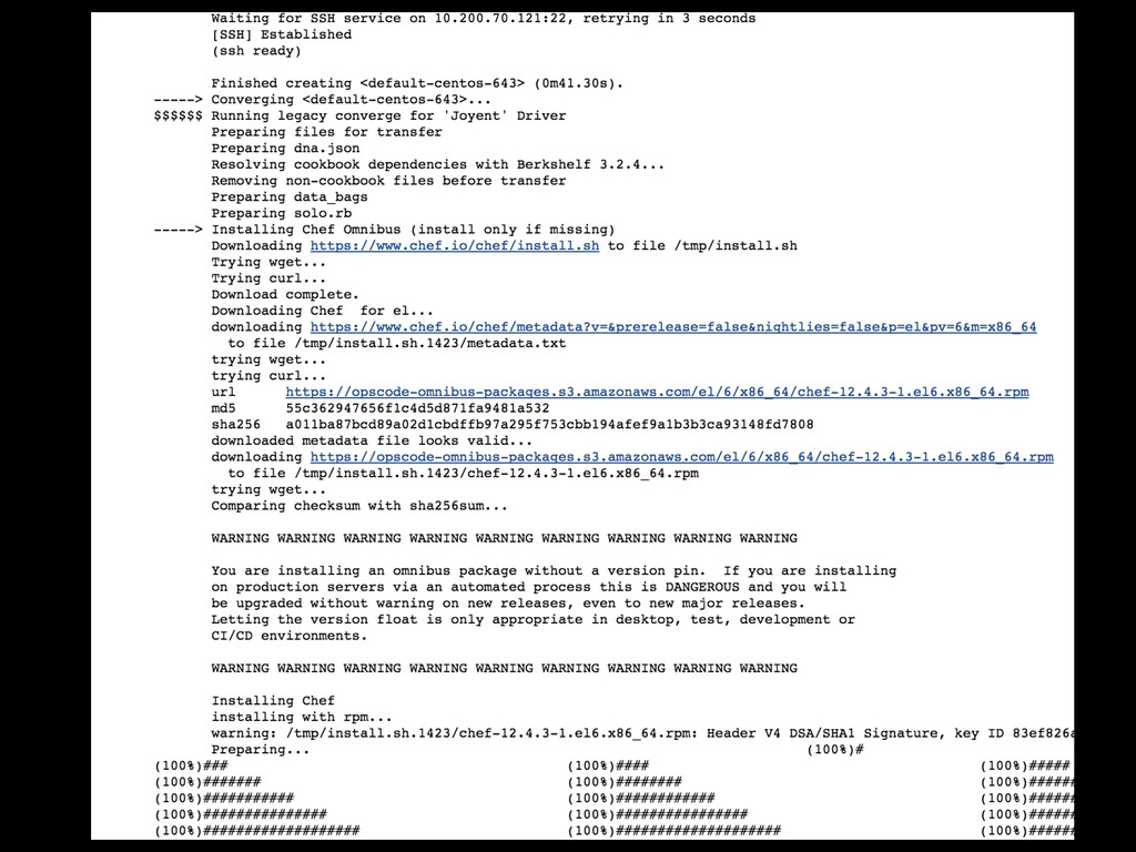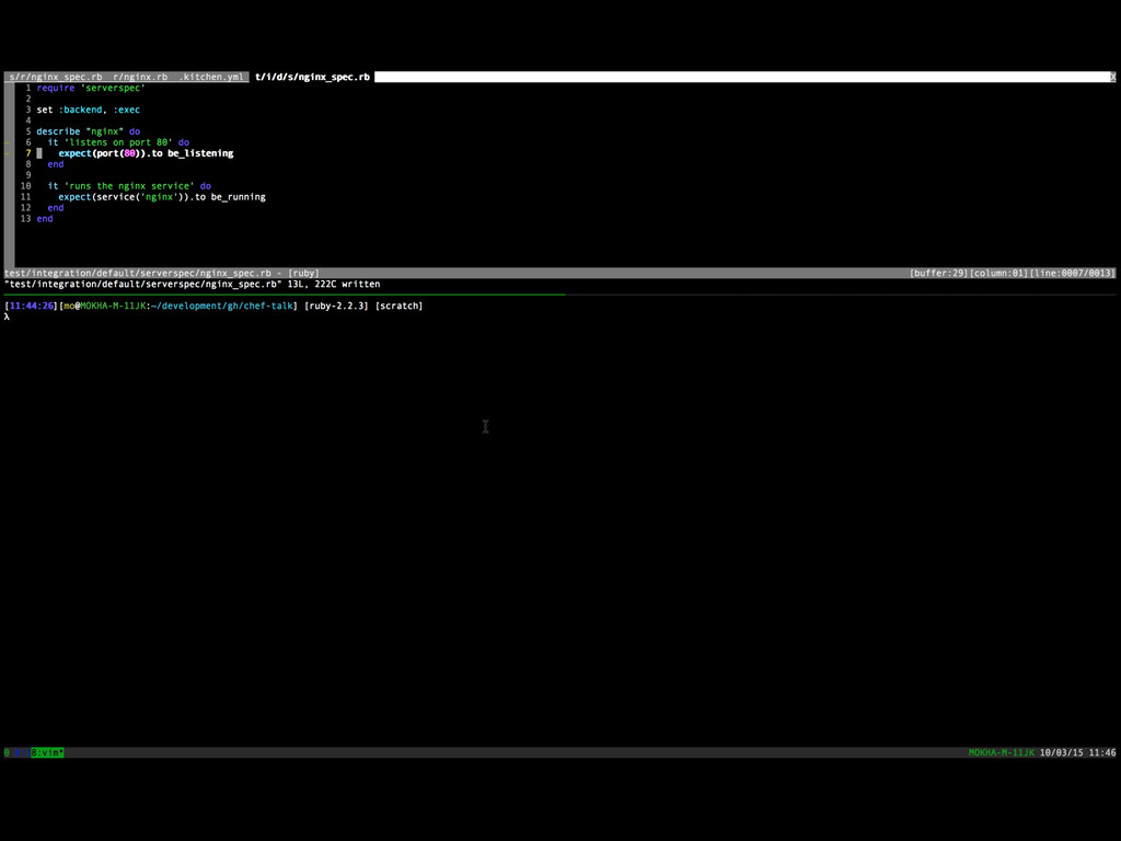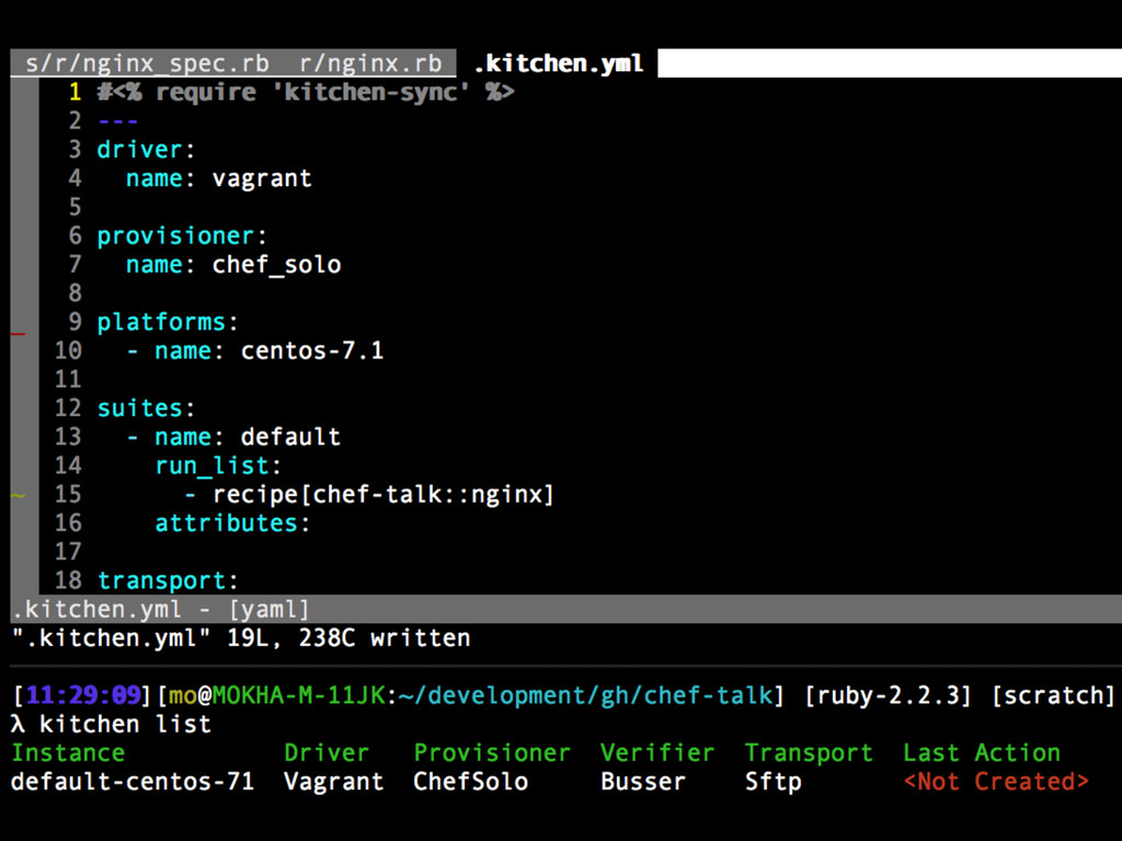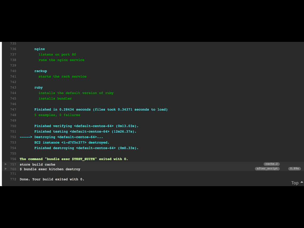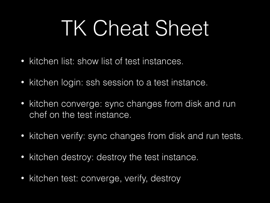 instances. • kitchen login: ssh session to a test instance. • kitchen converge: sync changes from disk and run chef on the test instance. • kitchen verify: sync changes from disk and run tests. • kitchen destroy: destroy the test instance. • kitchen test: converge, verify, destroy