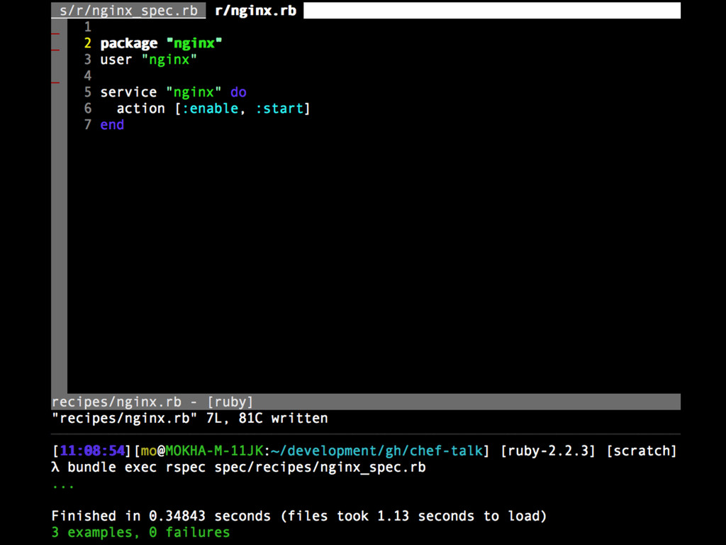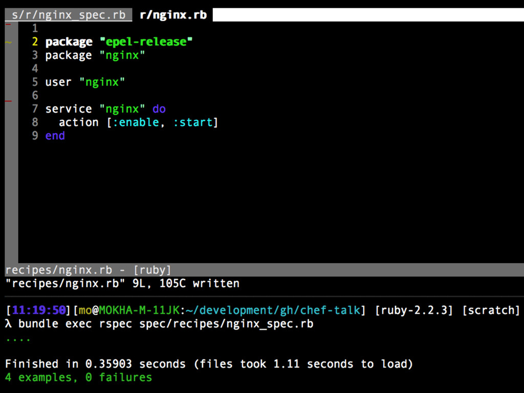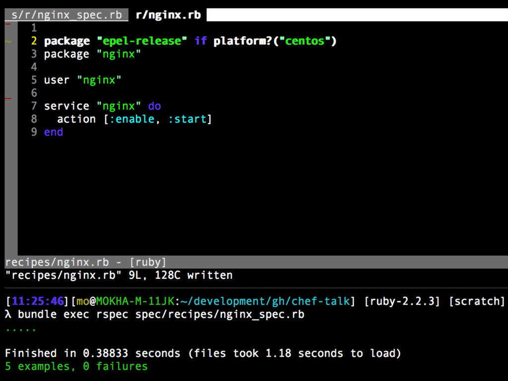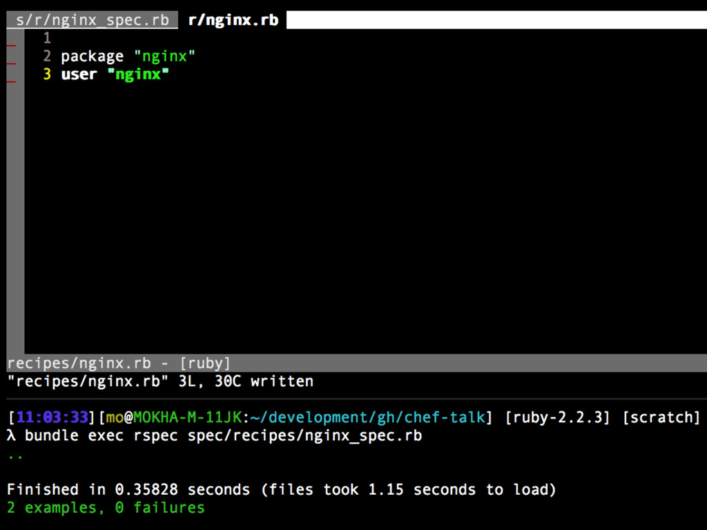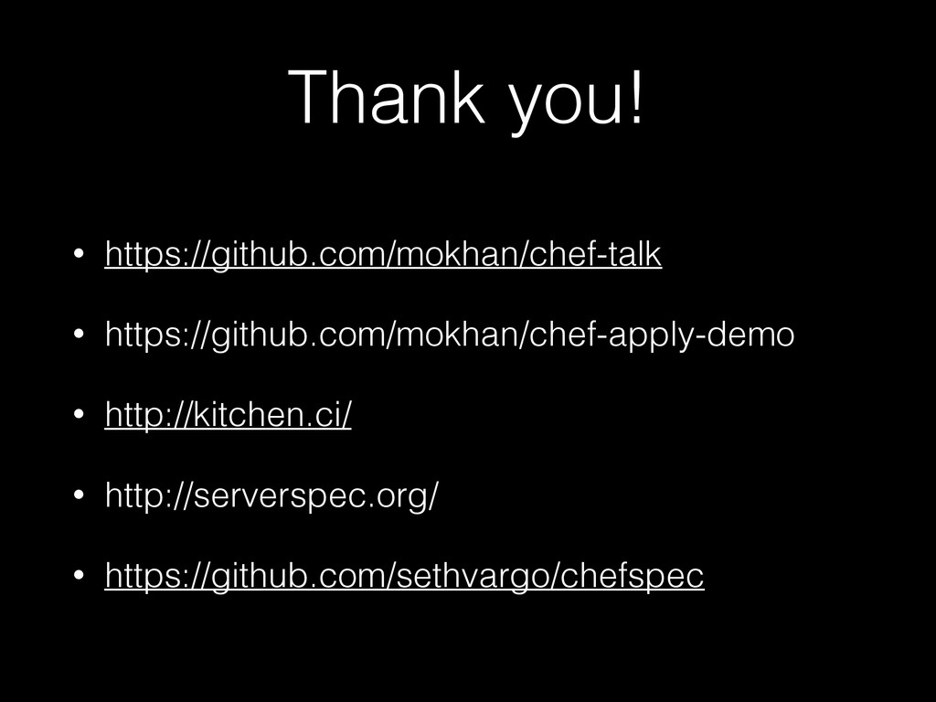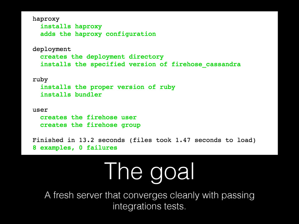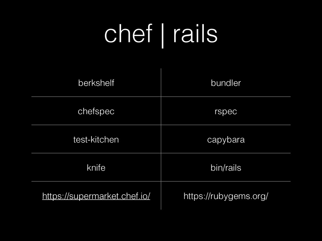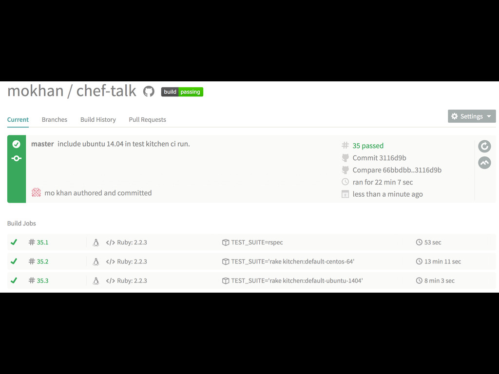 instances. • kitchen login: ssh session to a test instance. • kitchen converge: sync changes from disk and run chef on the test instance. • kitchen verify: sync changes from disk and run tests. • kitchen destroy: destroy the test instance. • kitchen test: converge, verify, destroy