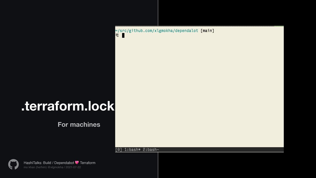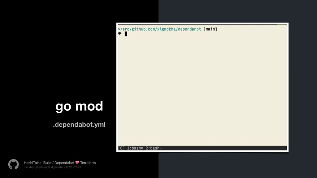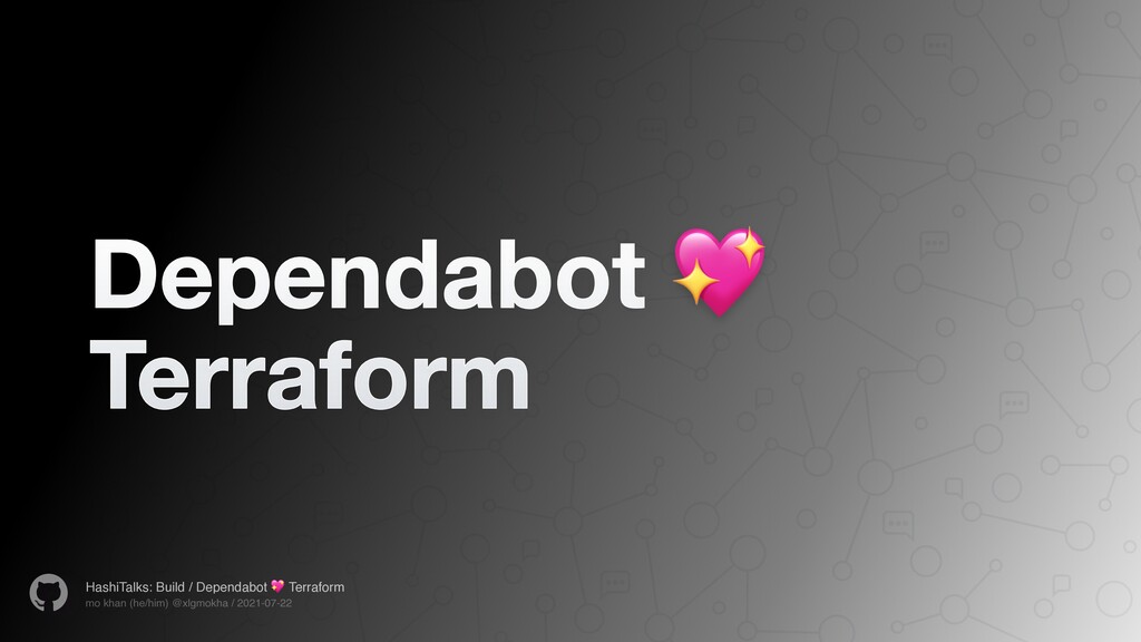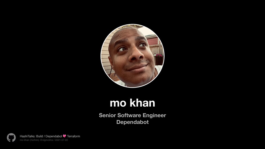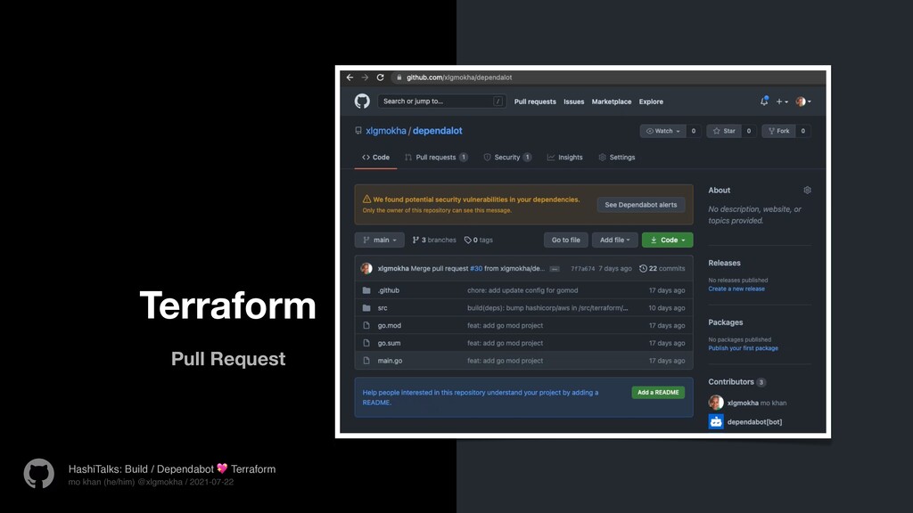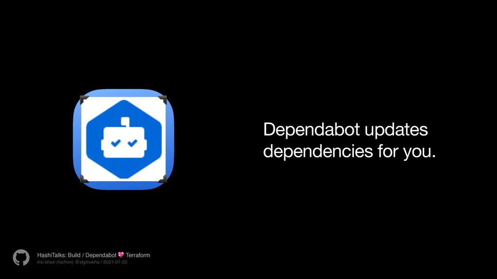 HashiTalks: Build / Dependabot 💖 Terraform mo khan (he/him) @xlgmokha