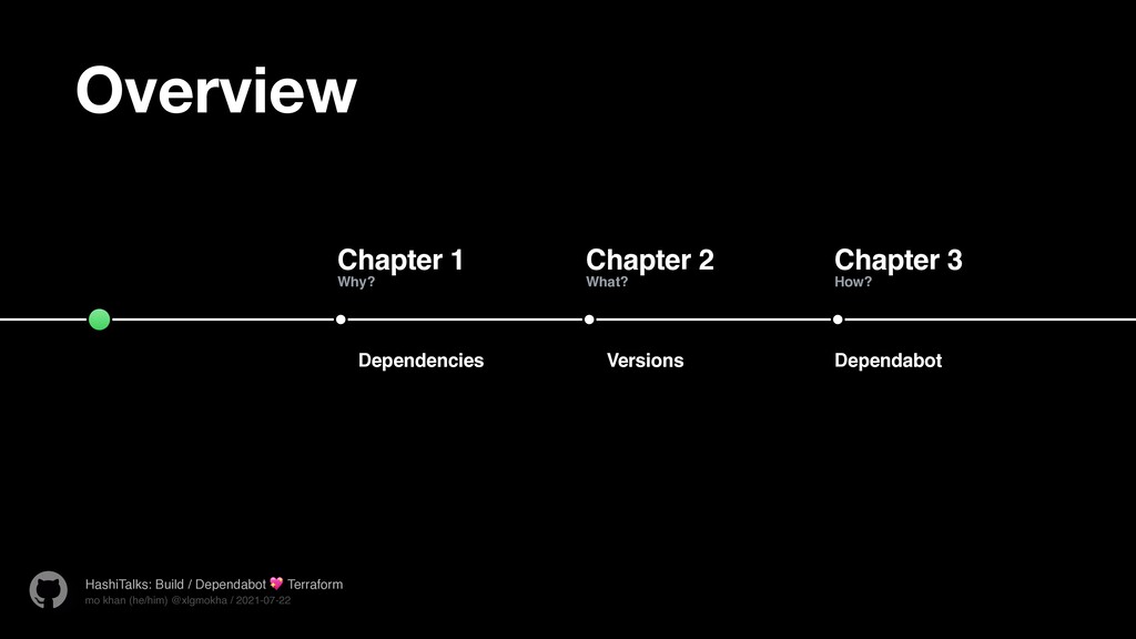 / 2021-07-22 Chapter 1 Why? Chapter 2 What? Chapter 3 How? Dependabot Versions Dependencie s Overview