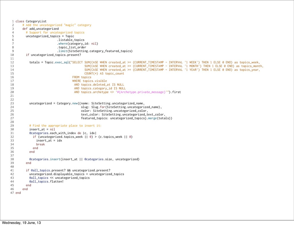3 def add_uncategorized 4 # Support for uncategorized topics 5 uncategorized_topics = Topic 6 .listable_topics 7 .where(category_id: nil) 8 .topic_list_order 9 .limit(SiteSetting.category_featured_topics) 10 if uncategorized_topics.present? 11 12 totals = Topic.exec_sql("SELECT SUM(CASE WHEN created_at >= (CURRENT_TIMESTAMP - INTERVAL '1 WEEK') THEN 1 ELSE 0 END) as topics_week, 13 SUM(CASE WHEN created_at >= (CURRENT_TIMESTAMP - INTERVAL '1 MONTH') THEN 1 ELSE 0 END) as topics_month, 14 SUM(CASE WHEN created_at >= (CURRENT_TIMESTAMP - INTERVAL '1 YEAR') THEN 1 ELSE 0 END) as topics_year, 15 COUNT(*) AS topic_count 16 FROM topics 17 WHERE topics.visible 18 AND topics.deleted_at IS NULL 19 AND topics.category_id IS NULL 20 AND topics.archetype <> '#{Archetype.private_message}'").first 21 22 23 uncategorized = Category.new({name: SiteSetting.uncategorized_name, 24 slug: Slug.for(SiteSetting.uncategorized_name), 25 color: SiteSetting.uncategorized_color, 26 text_color: SiteSetting.uncategorized_text_color, 27 featured_topics: uncategorized_topics}.merge(totals)) 28 29 # Find the appropriate place to insert it: 30 insert_at = nil 31 @categories.each_with_index do |c, idx| 32 if (uncategorized.topics_week || 0) > (c.topics_week || 0) 33 insert_at = idx 34 break 35 end 36 end 37 38 @categories.insert(insert_at || @categories.size, uncategorized) 39 end 40 41 if @all_topics.present? && uncategorized.present? 42 uncategorized.displayable_topics = uncategorized_topics 43 @all_topics << uncategorized_topics 44 @all_topics.flatten! 45 end 46 end 47 end Wednesday, 19 June, 13